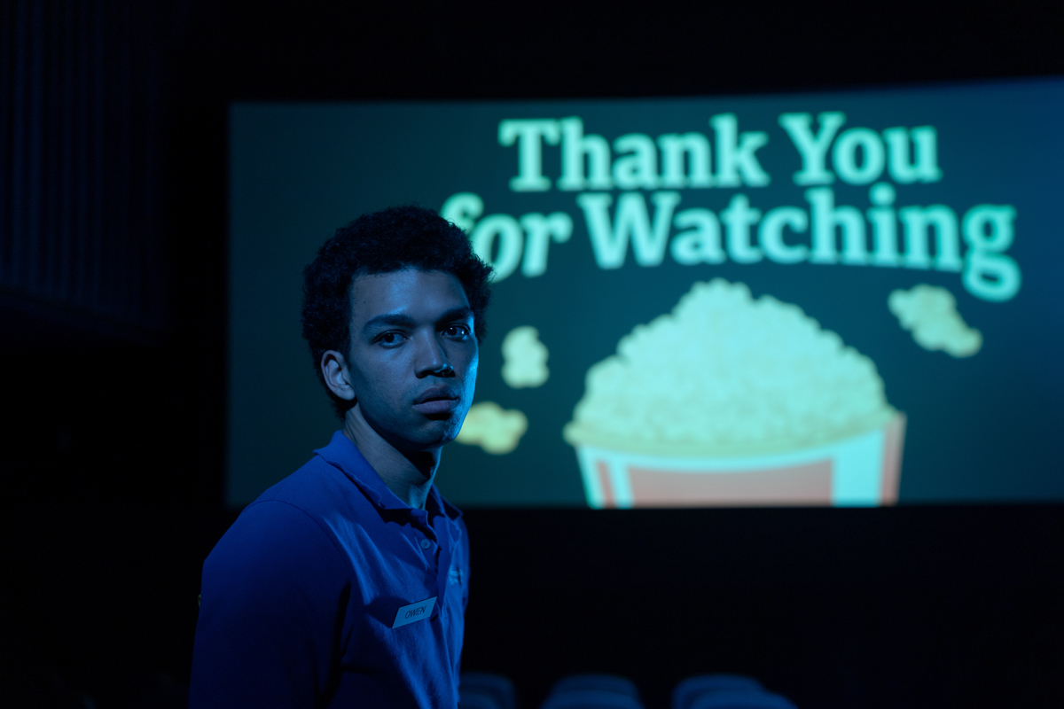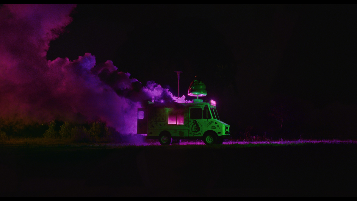 The bulk of the film concerns Owen from his teenage years onward (played at these ages by Justice Smith). In 1998, he continues his fandom of the show by watching VHS tapes sent to him by Maddy, clinging to its cheesy fantasy as a reprieve from a cold father (Fred Durst), an ailing mother (Danielle Deadwyler), and the growing anxiety that there is something different about him that he does not understand. Trying to explain his internal turmoil to Maddy on the benches overlooking the school’s empty football field, Owen is achingly inarticulate, uneasy in his own skin. Maddy asks him if he likes girls or boys. “I think I like TV shows,” he responds. As the film depicts Owen in his twenties and beyond, his inner discomfort builds and the monstrous world of The Pink Opaque begins to bleed into his reality.