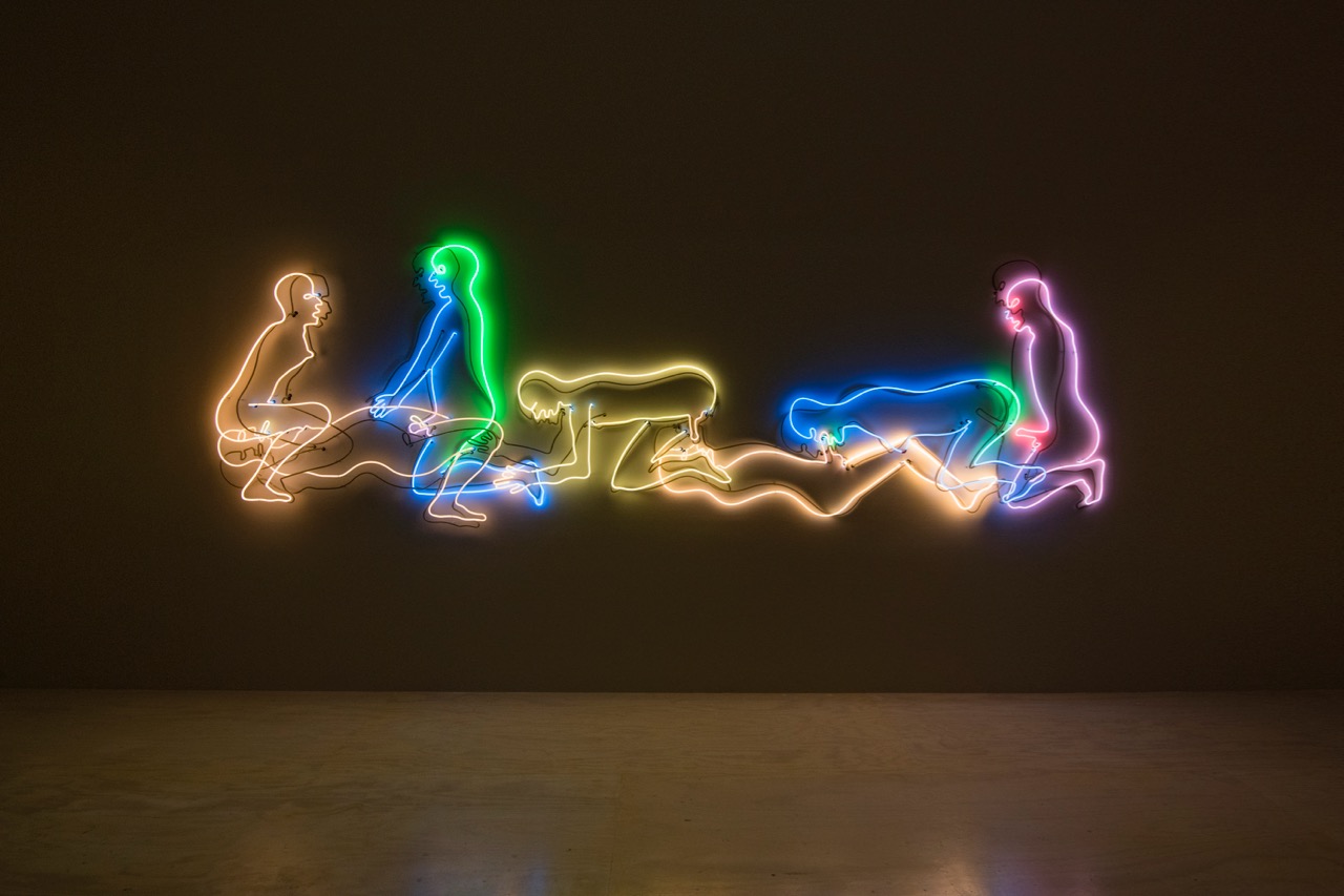 On display in a darkened room at PS1, with the rainbow colors diffusing across the walls and ceiling as it flickers like an inappropriate holiday decoration, Seven Figures is easily the most unselfconsciously beautiful piece in the show. It’s also, by virtue of its materials and explicit subject, in wonderfully bad taste—the shock value must have been gigantic in 1985; figurative work alone was déclassé then, let alone figures fucking.