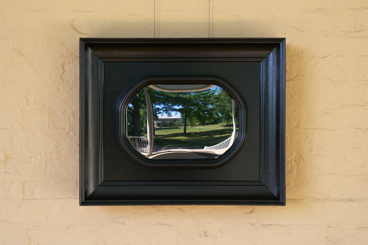 Cole’s house, where he was first a boarder, then married the proprietor’s niece and came to live, is a museum that sits between reenactment and revisionism. Now, a bulging black mirror hangs by the front door. Elaborately framed, it could be a security device meant to fit in with the historic-house-site vibe, but is actually an installation by Mohawk artist Alan Michelson, The Ratio of Art to Nature (2008), part of his solo exhibition, responding to Cole’s legacy, installed throughout Cole’s home. It is on view concurrently with Native Prospects, a group show curated by Mohawk academic Scott Manning Stevens, which presents Indigenous approaches to the landscape tradition, all hanging in Cole’s studio.