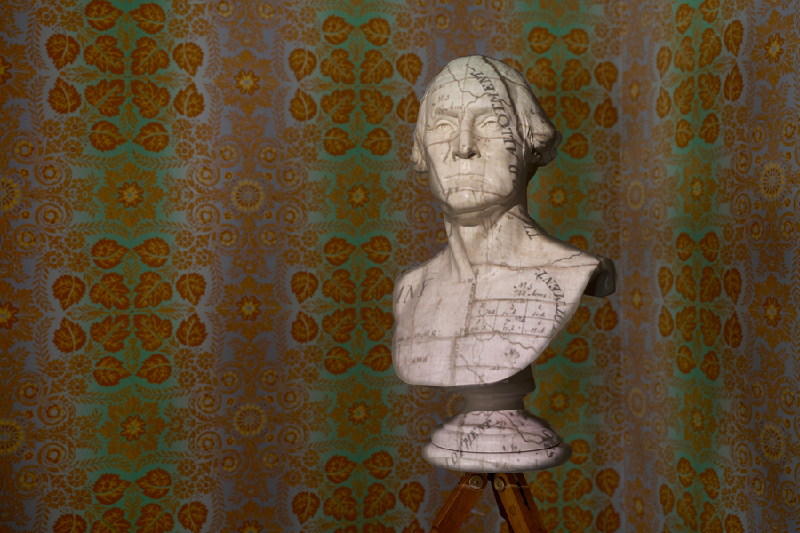In the sitting room, a marble bust of George Washington, the one that makes him look like an American Caesar, stands in the corner. It would be easy to assume the sculpture is some Victorian curio. Then video flashes across Washington’s placid face. Flames lick, maps scroll. The image freezes on a roadside historic marker, then another and another across upstate New York. Words distort on Washington’s forehead: “Seneca Nation Destroyed, Sept. 17, 1779.” And, “Destroyed During Sullivan Campaign Sept. 21, 1779.” “Village Dest–” curves over the face, again 1779. Voices repeat a word, “Hanödaga:yas.” The intonations hold the downbeat, the breath—grief.