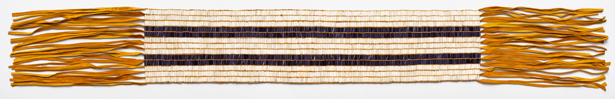 Richard David Hamell, Two Row Wampum / Guswenta Belt, 2022. Deer leather, artificial sinew, and polymer beads, 6 1/2 × 52 inches. Courtesy the artist and Thomas Cole National Historic Site.