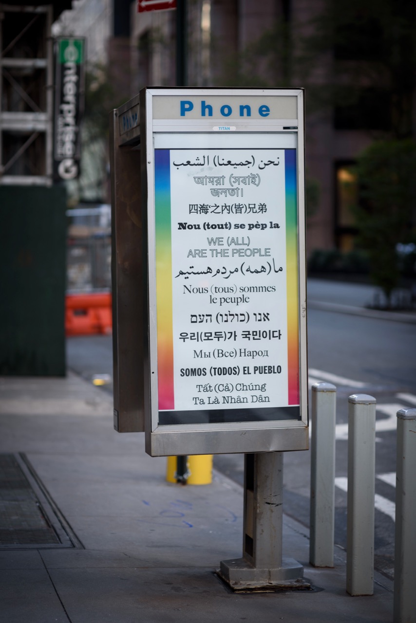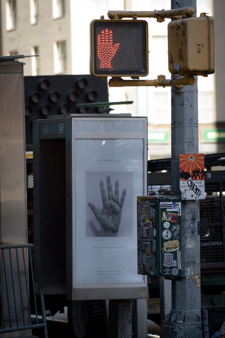 The less successful works in TITAN don’t get how neglected public space has become (the payphone is simply a metonym for its superannuation). Examples of capital-P public art, these interventions brim with the utopian possibility that often accompanies the idea of doing something outside. Equating the street with the public and the masses with politics, these artists seem to have forgotten that their contributions are unique one-offs rather than individual instances of larger campaigns. Patti Smith, for example, offers an encomium to democracy: a photograph of the word Vote written on a Caucasian palm, captioned It’s in our Hands, while Glenn Ligon delivers pictures of two neon sculptures spelling out November 3, 2020 and November 4, 2020, and a photograph of raised hands, promising a paradigm shift on Election Day. Rirkrit Tiravanija blithely encourages passersby to Remember in November. Hans Haacke’s contribution is more far-reaching—a poster he has used on many occasions, declaring, in many languages, We (All) Are the People, bordered by a color-wheel rainbow gradient. Anodyne agitprop, all of these messages struck me as repetitious, complacent, and familiar.