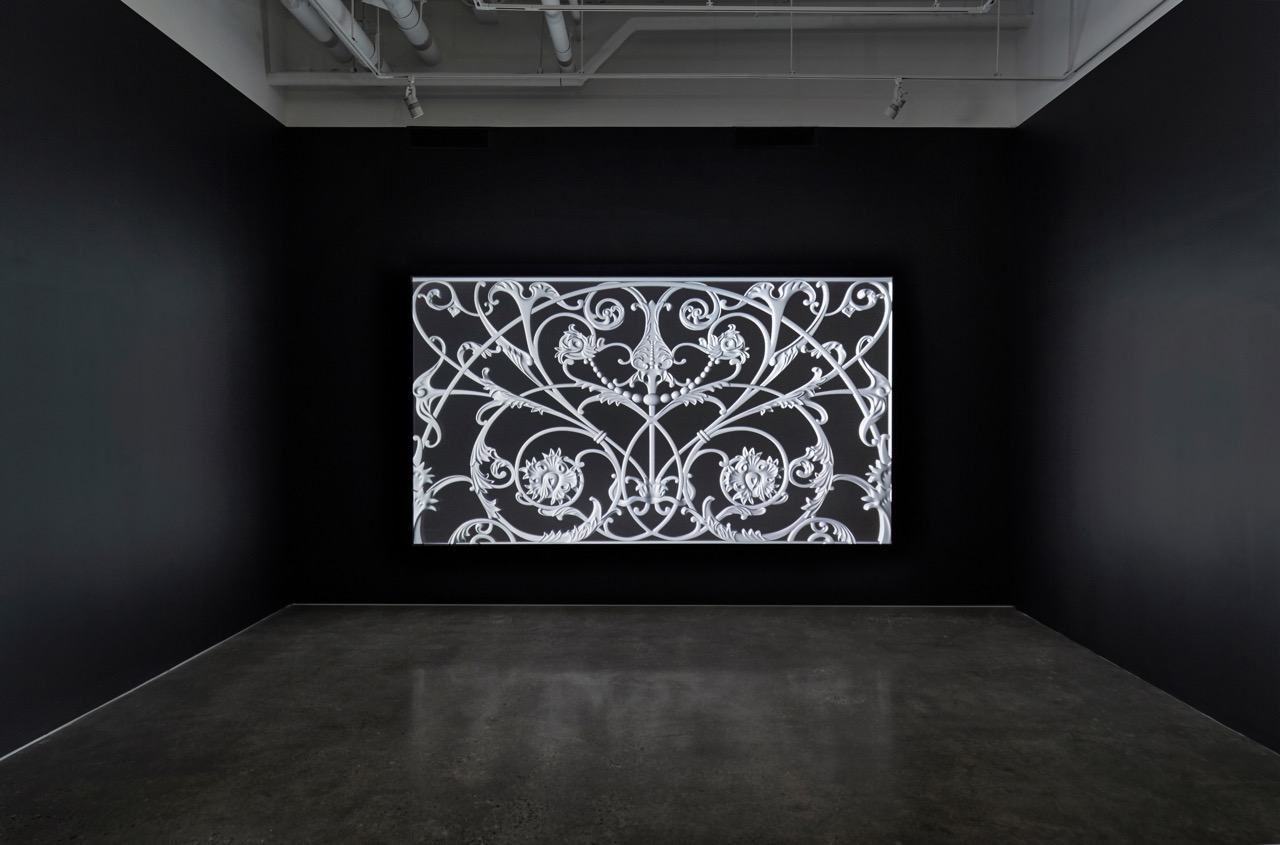 Consisting of two silent, sumptuous, and somewhat ponderous digital projections, the exhibition is titled Midwest in reference to the central swath of the US. (Born in Sheffield, Burgin has always kept an eye on goings-on in the States, and another body of work, US 77, is currently up at the Slought Foundation in Philadelphia.) While this is suggestive territory to map in an election year, Burgin’s videos are far removed from current exigencies: instead they depict desert flats, eerie interiors, startling rock formations, modern architecture. Prairie (2015) tells the tale of Mies van der Rohe’s Illinois Institute of Technology campus in Chicago, and the destruction of an apartment building called the Mecca, while Mirror Lake (2013) looks at Frank Lloyd Wright’s Taliesin and the native peoples who once inhabited nearby land. Each offers a combination of text and high-definition image, often computer generated. Invested in architectural ornament, which they treat as the bearer of social relations turned into form, the videos are intriguing, but they give off the strange air of an academic exercise. The shift in Burgin’s work from the mid-1970s to today seems bound up with changing conceptions of photography, as well as a changed treatment of architecture. His early work engaged the architectural space where art is presented and understood the photograph as a physical index of the object it depicted, a certain mode of documentary, which it placed alongside other realities. Here the real occurs in a specifically digital form of imagination. Moreover, while the earlier work maintained an agonistic relationship to the gallery, here, with the white cube turned into a black box, it simply feels ambiguous: these enlarged PowerPoints could happily loop on any number of screens, and yet their target remains unclear.