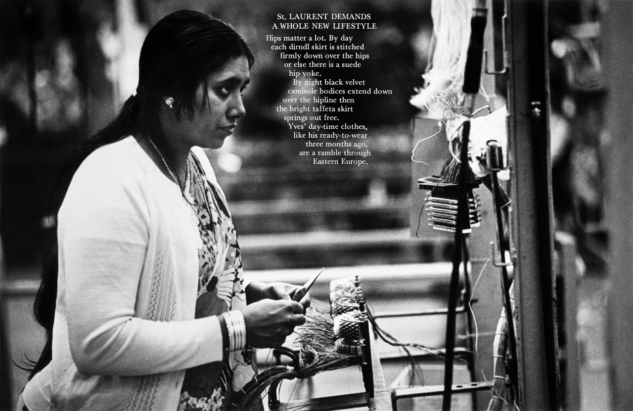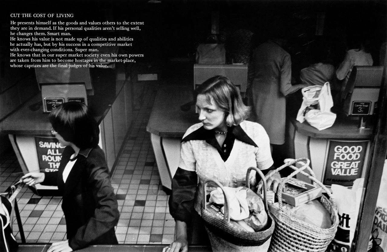 Burgin shot these photographs as part of a commission from the National Community Development Project, a UK national charity, but, in their strange lack of empathy, the images depart from traditions of picturing “the other half,” swinging between something like surveillance footage and promotional materials. They also destabilized quaint ideas of Englishness on the twenty-fifth anniversary of the Queen’s accession; while there is one image of village life (notably tagged with a sign reading “PRIVATE”), there are many more pictures of fashion spreads and urban ennui. Moreover, the stanzas of text implanted in each photo—more than captions, one might think of them as prose poems—connect with language-based conceptualism and the lingua franca of advertising at the same time. Their tone is inconsistent: they speak breathlessly of Yves Saint Laurent fashions in one instance and parrot the syntax of Marxist philosopher Louis Althusser in another. Strange parables of surveillance and wage labor, they are alternately didactic and enigmatic, with no consistent narrator standing behind.