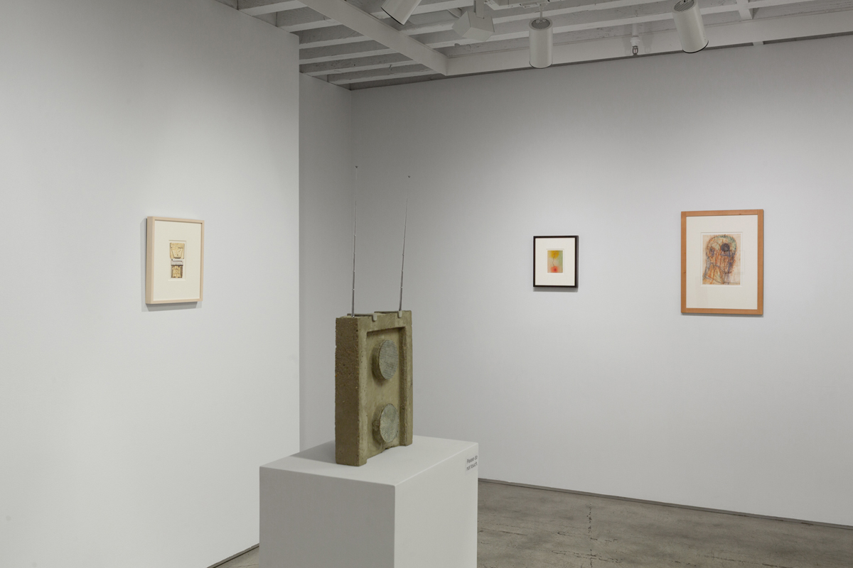 Voice of Space: UFOs and Paranormal Phenomena, installation view. Courtesy the Drawing Center. Photo: Daniel Terna. Pictured, center foreground: Isa Genzken, Weltempfänger Daniel (World Receiver), 1990.