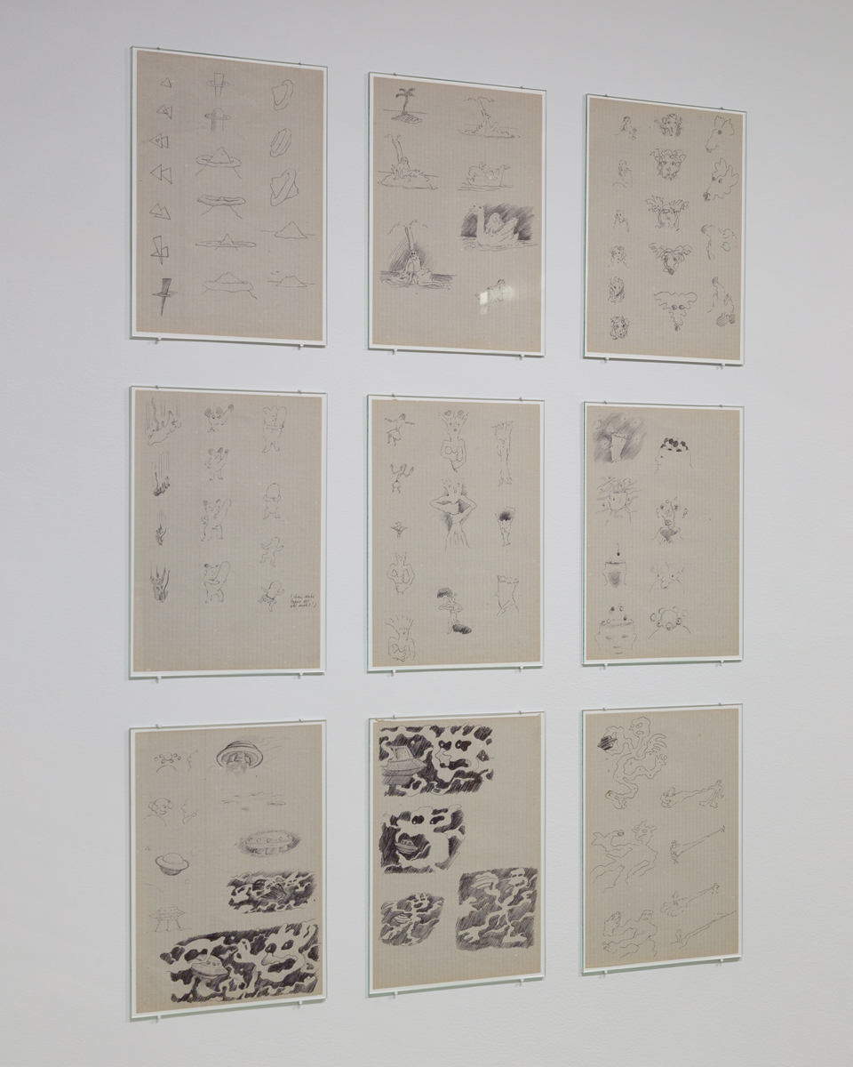 Voice of Space: UFOs and Paranormal Phenomena, installation view. Courtesy the Drawing Center. Photo: Daniel Terna. Pictured: David Weiss, Untitled (Wandlungen), 1975.