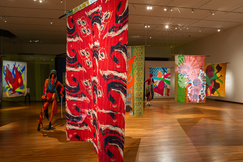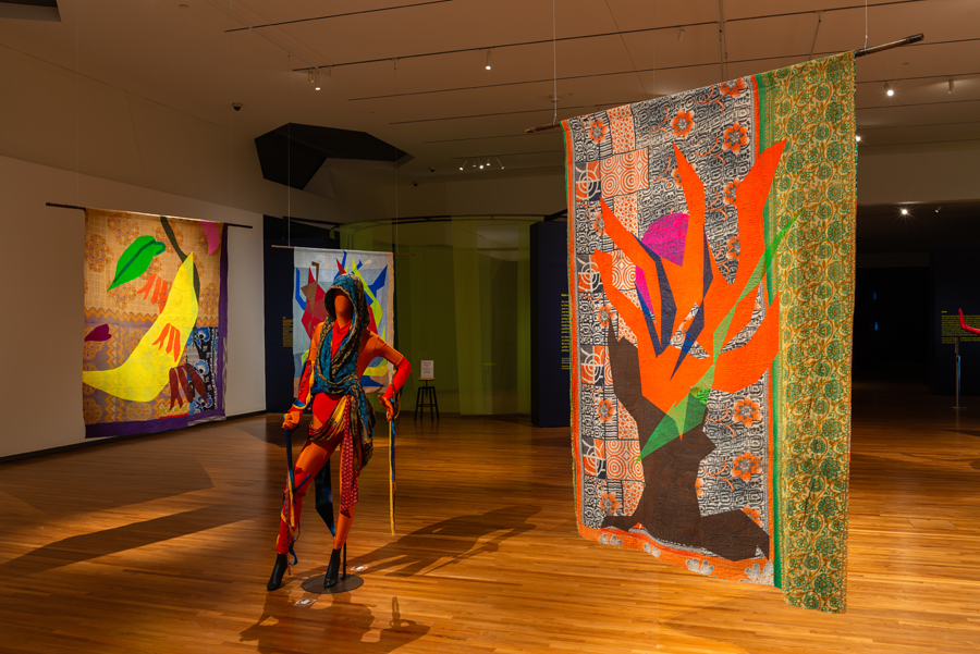 This is a unique collaboration in the arts. And, yes, the technology can travel numerous places at once. But, in this troubling sense, the pragmatic might ask, does installation art have the power to inspire change? Nature is the heart-beating topic, but is its process natural, tangible? Am I being selfish when I proclaim that I want to see and feel the real opera! No, I do not wish to walk away from the garden with an electronic buzz in my head. But, at first, maybe I missed an important fact. Yes, Night in the Garden of Love is inevitably an opera for this time we are living in. If one thinks about the exhibition, the lively imagery and hues and its daring use of virtual reality, we shouldn’t be surprised that Shezad Dawood is bridging traditions of the past—for instance, working in fabrics—with media of this digital age. Yet I would argue that his garden does not bear the symmetry of the wild; still, in Dawood’s presentation, a tree or thick vine would never grow around a strand of barbed wire.