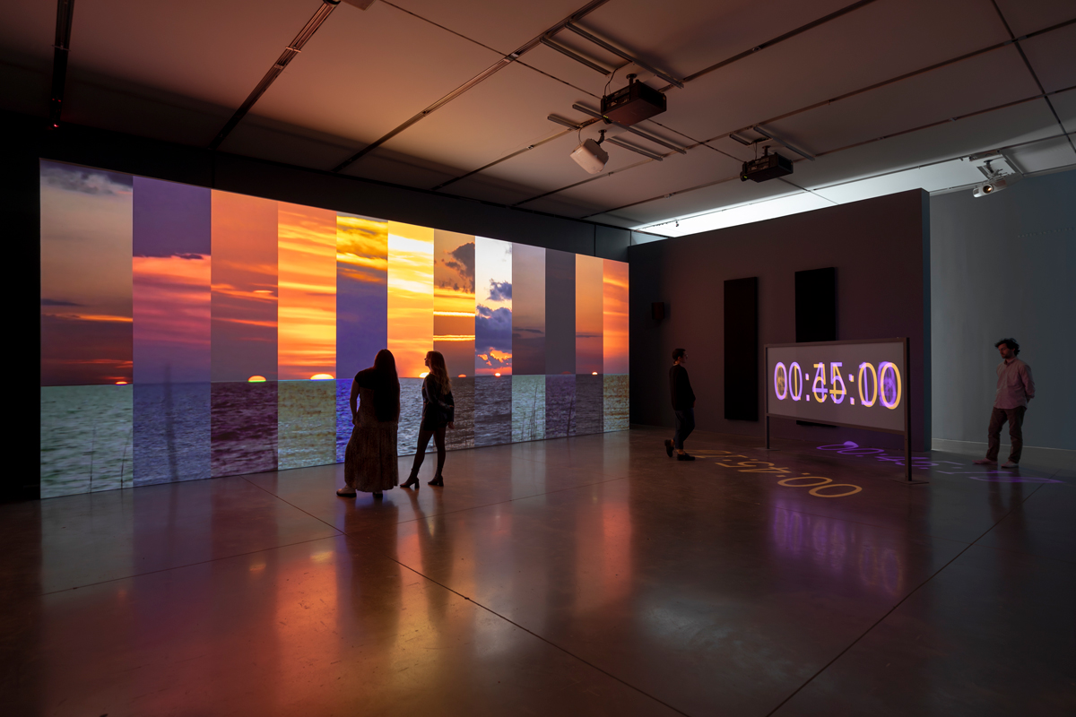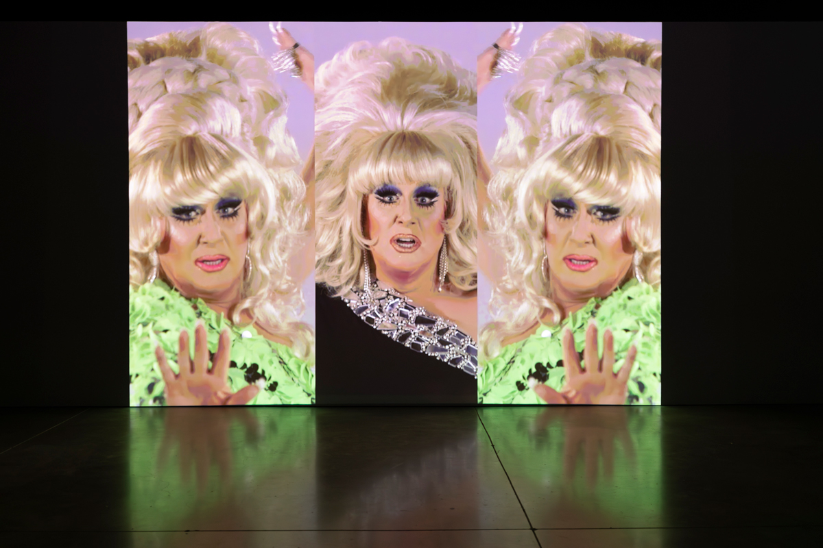 In another gallery, Lady Bunny takes front and center in The Tyranny of Consciousness, Atlas’s magnum opus from 2017. Comprising thirty-six different shots of the sun setting, with a countdown clock ticking off the seconds nearby, the piece feels even more ominous at this moment in time. Bagpipes—traditionally used both to rouse the troops to battle and to honor the dead—play while Bunny, in voice-over, delivers a breathless monologue about the toxic mess of American politics.