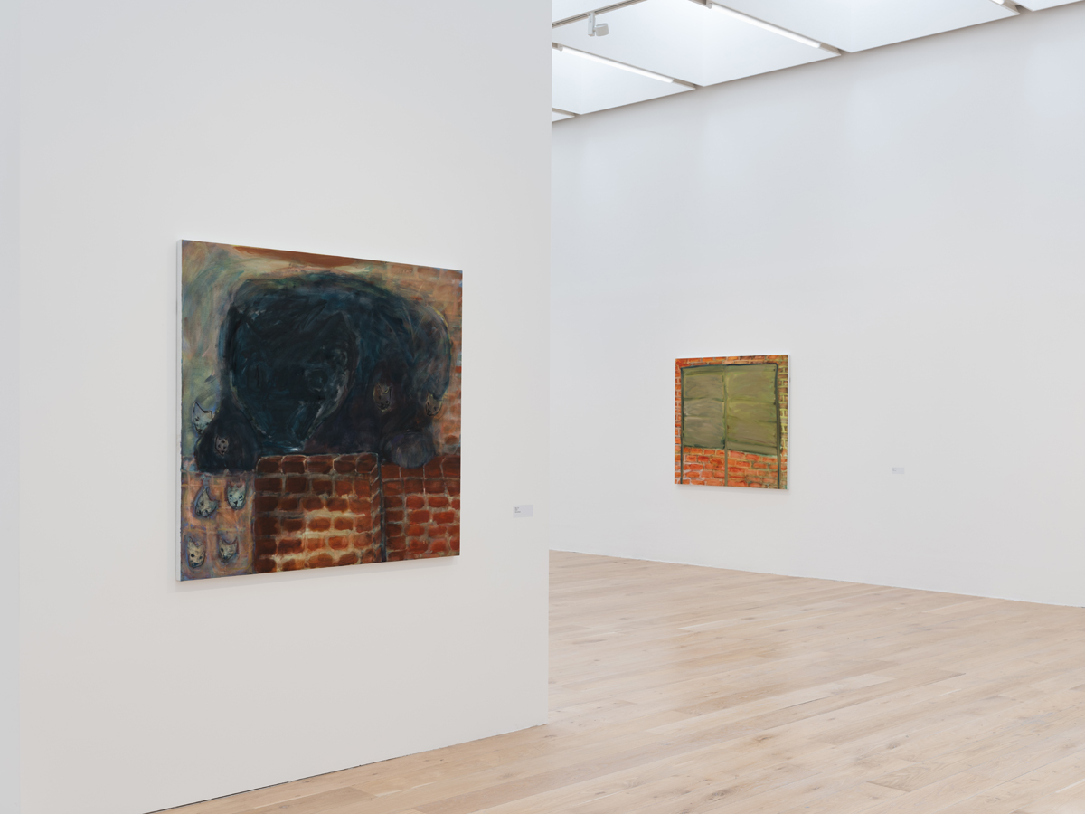 In other works, the “hooks” are images and details that repeat throughout the sparely hung canvases and echo each other in looping, associative chains. Recurrent forms are sometimes identical (dogs, clocks, legs, brick walls, handheld fans) and sometimes subtle pseudomorphic transmogrifications (moths and bowties, latches and striped fabric, pillars and curtains). Other connections are stylistic and technical—a soft palette that is warm, tinged with rose or peach, even when suffused by cool blues, purples, and greens; the thin and loose application of oil paint so that the fibers of the support beneath, particularly when linen, lend a tactility to the compositions; the use of framing devices to guide, delimit, and destabilize vision. Shone Upon (2022) shows a brick wall with a large, messily painted rectangle sitting in its center; from the shape descend three long strokes, like supportive legs, reaching to the bottom edge of the canvas. It could be a window, shutters, a poster, a freestanding screen. It could be a play on the figurative versus the abstract—a vivid muddy-green cataract that forces us to engage with the two genres simultaneously. “It’s very hard to unlock how to look at something,” Nashashibi has said, perhaps hinting at how her paintings playfully confound expectations, conjuring in-between states of both body and mind. Painting is about marshaling space, about learning and unlearning how and why and what we see within the constructed image as within the wider world; it hangs (so to speak) between the fabricated and the real, and we apprehend both at once in pictures that are as familiar as they are strange.
