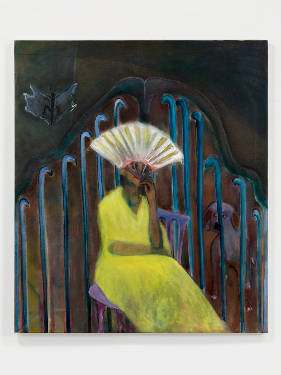 Rosalind Nashashibi, The Yellow Dress (Morisot with a Fan), 2022. Oil on linen. Courtesy the artist and GRIMM. © Rosalind Nashashibi.