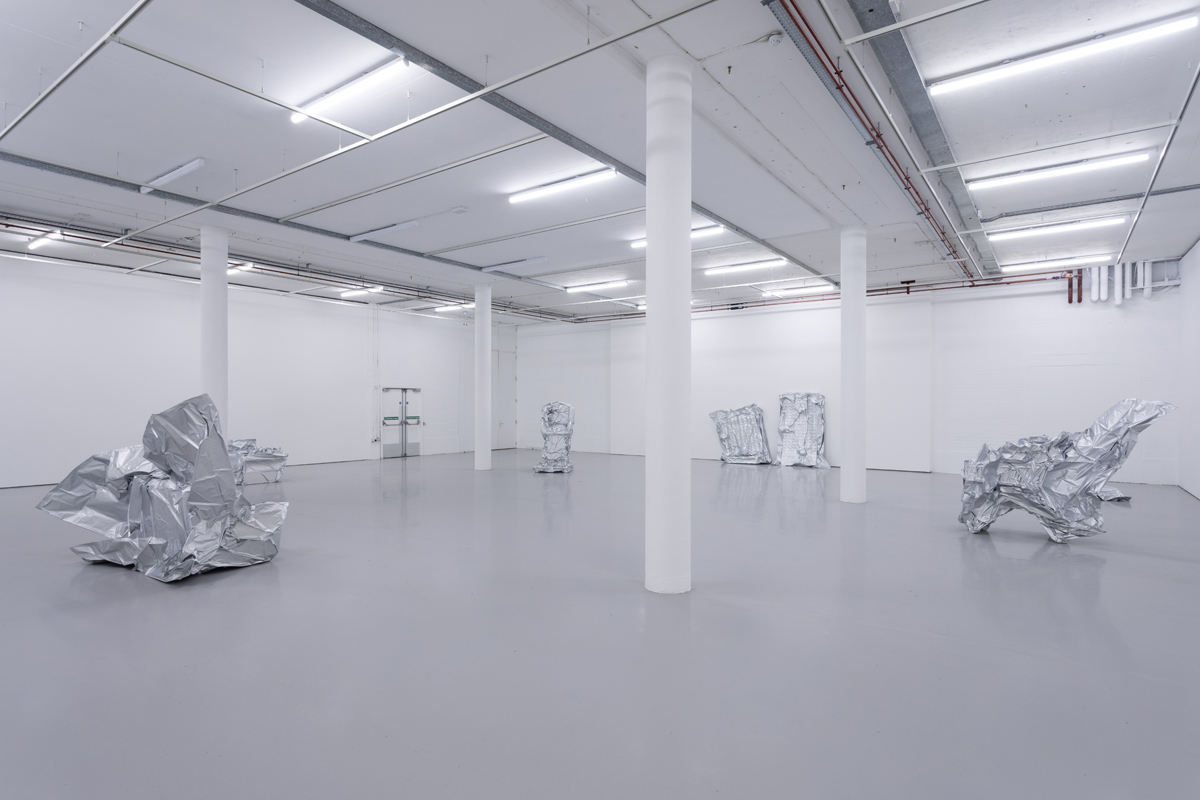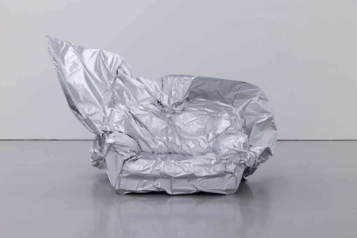 The largest space in the exhibition holds detritus found in Bristol dumpsters—couches, chairs, toilet seats, mattresses, shopping carts—sealed and vacuum-packed in enormous bright aluminum bags. The effect of the air being sucked out has pulled the shining fabric into strange geometrics, so that one man’s trash has become wild, flying forms (one couch seems to have wings, the shopping cart looks possessed by velocity) somewhere between John Chamberlain sculptures and Andy Warhol’s room of floating metallic balloons. Practically, the seal renders the potentially toxic accumulated and illegally dumped debris safe and useful, seductive and even beautiful—a silver lining.