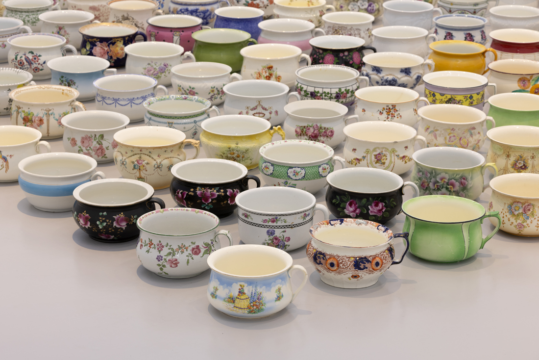 For now, the gallery is a temporary resting place, where the commodes sit alongside a technically more precious but equally forsaken family bequest. Unlike the sea of ceramic bedpans, however, Sir William Bellingham’s two trunks filled with George III silver remain locked shut. A series of emails tacked to the wall show the bureaucratic process of transferring the trunks to the gallery from the vaults of NatWest bank, as well as an exhaustive list of their unseen glittering contents: pear-shaped urns, circular meat plates, chambersticks, sugar bowls, tea caddies, coffeepots, frequently odd numbers of cutlery, and what have you.