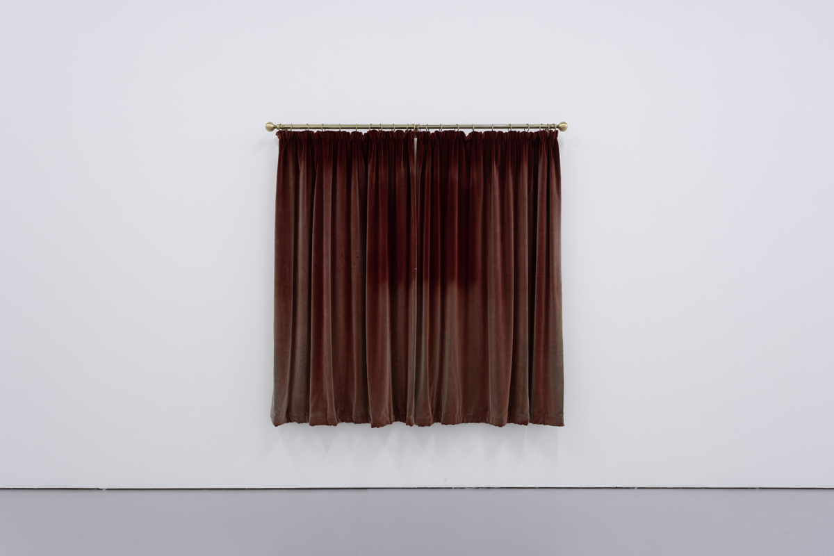 Near the entrance, a pair of faded red velvet curtains salvaged from the clearing of Ghislaine Maxwell’s disgraced terrace house hang, forever closed, on a wall-mounted brass rail. Across the center, where the two drapes meet, the fabric is marked with a darker red rectangle, as though a painting or placard protected this swath from sun bleaching. Another missing image, a mystery, a cataract vision that obscures as much as it reveals about how objects can be upended and repurposed. Rather than blankness or nihilism (the gray land is, we must concede, very green, sometimes sunny, blooming roses, rolling hills, crashing waves), the strategies employed by Ourahmane and Al-Maria are, to me, hopeful: the future is irreverent, unconvinced by permanence, fulsomely void, as in, we cannot imagine it by looking to the past.