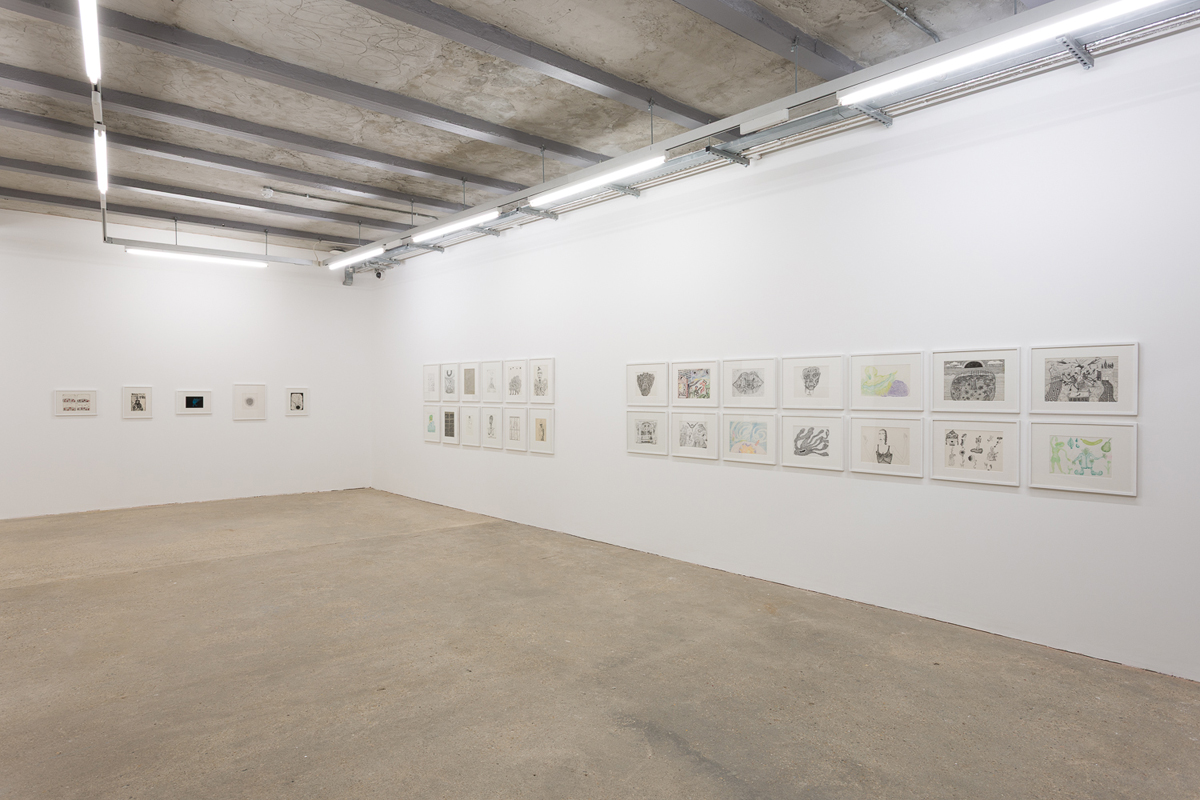 One might think contextually of Laing’s anti-psychiatry movement and the art his patients made at Kingsley Hall in the mid-1960s, or Sylvère Lotringer’s legendary Schizo-Culture conference of 1975. Podolski’s visuals fly between Max Beckmann, Toyen, Shuvinai Ashoona, Jacqueline de Jong, Mary Ellen Solt, Robert Crumb, stoner drawings, jokes, doodles, the Book of Revelations. But the more I looked at Podolski’s work, the stupider it seemed to try to attach to it a lineage or a canon, even a radical one. Stupider, even, to try to describe or explain it, given its aims to doff semantic systems, to offer only rupture, not certainty, as if each image might disappear at any moment, or shift beneath the gaze, warp and twist and pull you in, if you’re lucky. I don’t know what any of it means, because, let’s face it, meaning is the problem, meaning is a trick, meaning brings us closer to the world we know and further from the world we want to imagine—somewhere less ugly than here, somewhere the self is multiple, somewhere everything is permitted. “We are never more than assistants to the void,” Podolski wrote in her novel, a deranged call to arms. This is the best, most shocking show I’ve seen this year, because I forgot what it was like to look at art invested enough in the world to stop giving a fuck about what it demands so absolutely—in art, life, whatever.