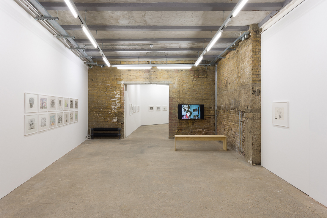 Sophie Podolski: Wisdom Should be Sung, installation view. Courtesy Goldsmiths CCA. Photo: Rob Harris. Pictured, center right, on brick wall: Joëlle de La Casinière, Dans la maison (du Montfaucon Research Center), 2017.