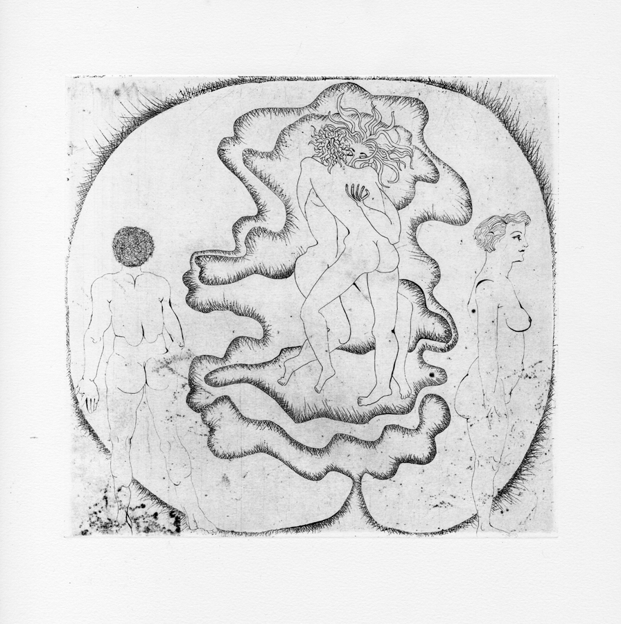 All the works are untitled, and all, save a handful from 1968 to 1970, are undated, but attributed to her time at Montfaucon. And they are fabulous, weird, scary, beautiful, funny, sad, haunting, revolutionary. Sinuous nude figures of ambiguous gender embrace in the midst of writhing clouds, an otherworldly miasma; a weathered, hollow-cheeked woman dressed like she’s on her way to a garden party, but for her long black gloves, reaches out to pluck a nude woman’s pert nipple while unidentifiably feathered creatures swirl and wheel overhead; a rotund woman sunbathes in a deck chair underneath which (what looks to me like) a massive turd steams in the sand; and a hirsute man sits cross-legged reading a newspaper whose floating headlines announce (in French, my translation here): 36 MURDERS YESTERDAY NIGHT — 3 KILLED 6 WOUNDED — BOMB ON THE ISLAND — INFANTICIDE — THE EXTERMINATION OF INDIANS.