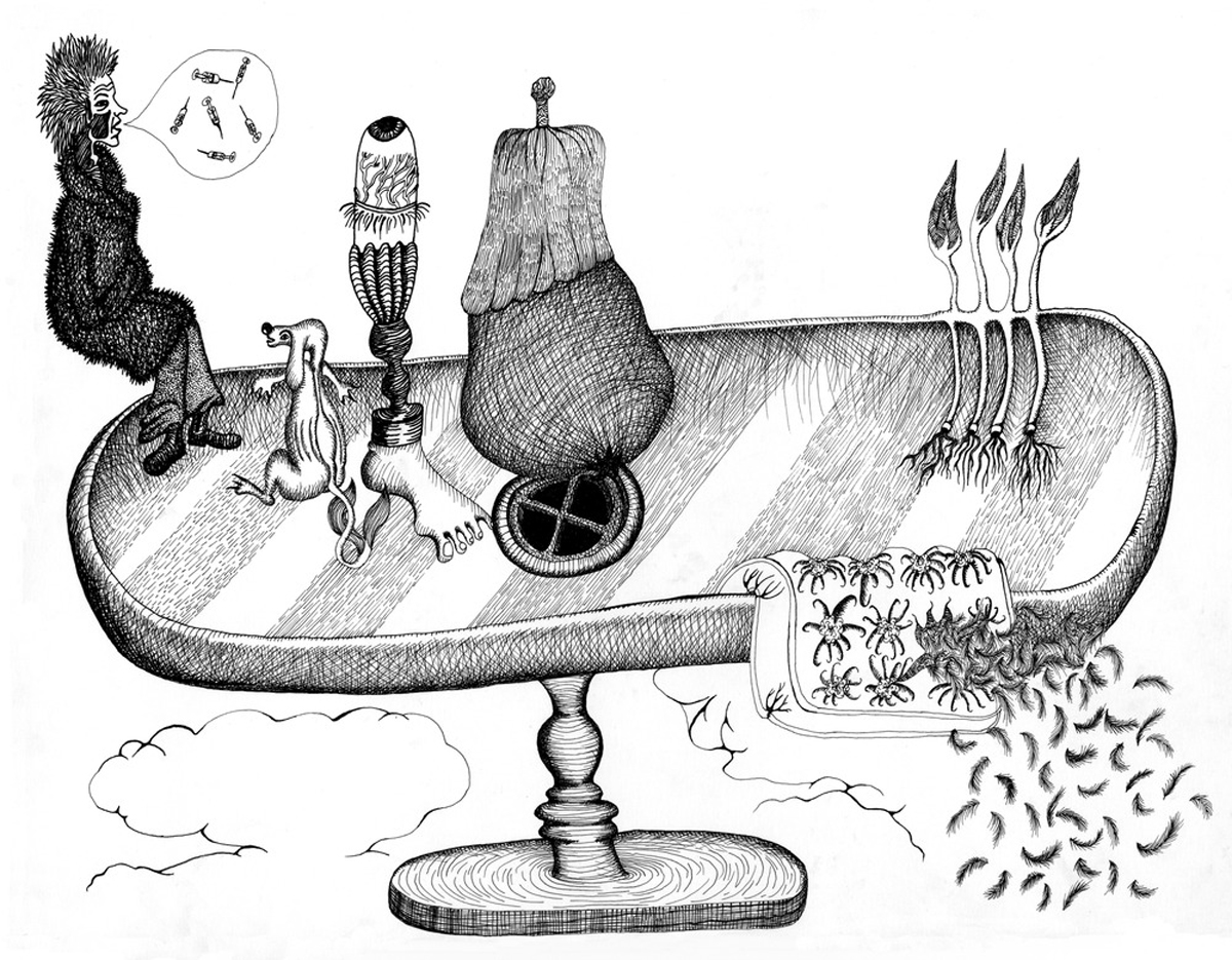 In other images, bodies transforming, grotesque satire, fantastical carnivalesque characters, and sometimes just body parts (by which I mean, primarily, genitalia) roam through imaginary worlds teeming with life, fellow alien creatures, hybrids, and who-knows-whats. One work shows a horse with a single hornlike eyeball, another an eyeless rat king in a toga worshipped by flanks of green armless, spermy mermen. Elsewhere, a walrus lady with black wings sucking from a gas pump that reads “BLACK BLOOD.” An army of clowns masturbate, and a flying cock and balls bursts from a jelly cake. Skies and landscapes and backgrounds and foregrounds are overtaken by dense graphic patterns and crosshatching, or remain blank, running with text spare or chaotic.
