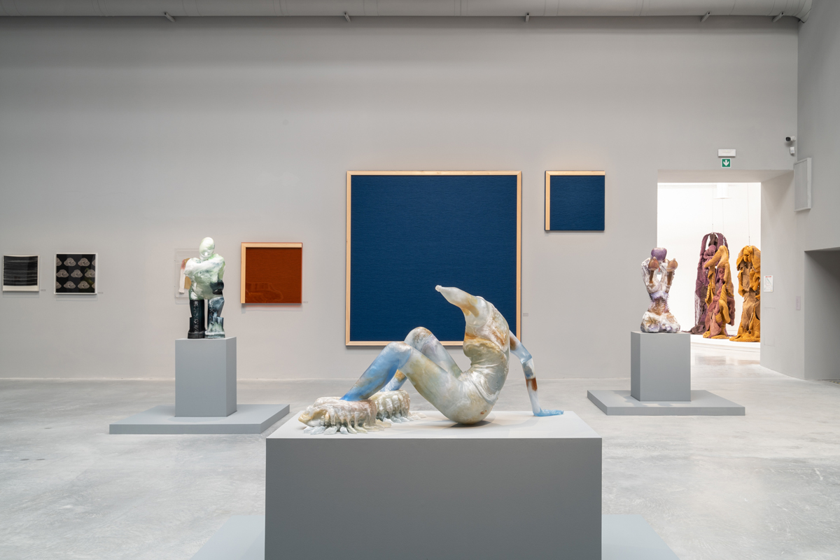 The Milk of Dreams, installation view. Courtesy La Biennale di Venezia. Photo: Marco Cappelletti. Pictured, foreground: works by Andra Ursuţa. Pictured, back wall: works by Rosemarie Trockel.