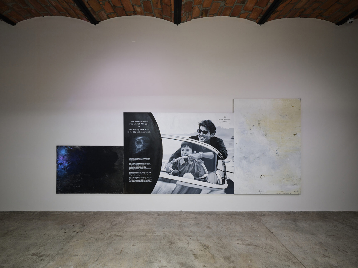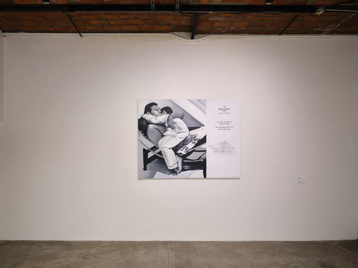 Speaking most directly to these latter concerns are Gregory’s Investment Pieces, two of which (No. 7 and No. 8, both 2024) are on display. These large-scale oil paintings mimic ads for the Swiss luxury watch manufacturer Patek Philippe, cribbing the ethereal aesthetics of an airport billboard—in this case, appealing to the fantasy of a jet-setting businessman with a wife and kids back home. In velvety gray scale, we see a man embracing his pajama-clad son with one hand and stroking a newspaper with the other, his eyes closed in tender introspection. “You never actually own a Patek Philippe. You merely look after it for the next generation,” reads text to the side of the image. Gregory’s ads are quasi-replicas of real ads from a Patek Philippe campaign, though the product itself is obscured in her renditions. Instead of a glistening silver timepiece, we see a wispy outline of the object behind a splash of sparkles. The watch is vanishing—a comment on the supposed durability attached to high-end goods, which makes them worthy of purchasing and passing down to one’s offspring. Gregory’s Investment Pieces ask what if all that’s bullshit?—calling attention to the emptiness of such marketing tools while also, through the painting’s eerie preciousness, giving the dream of financial success (specifically the kind that ensures a legacy) a dark undercurrent: if some of us are liberated by the gifts handed down by our forebears, surely others feel cursed.