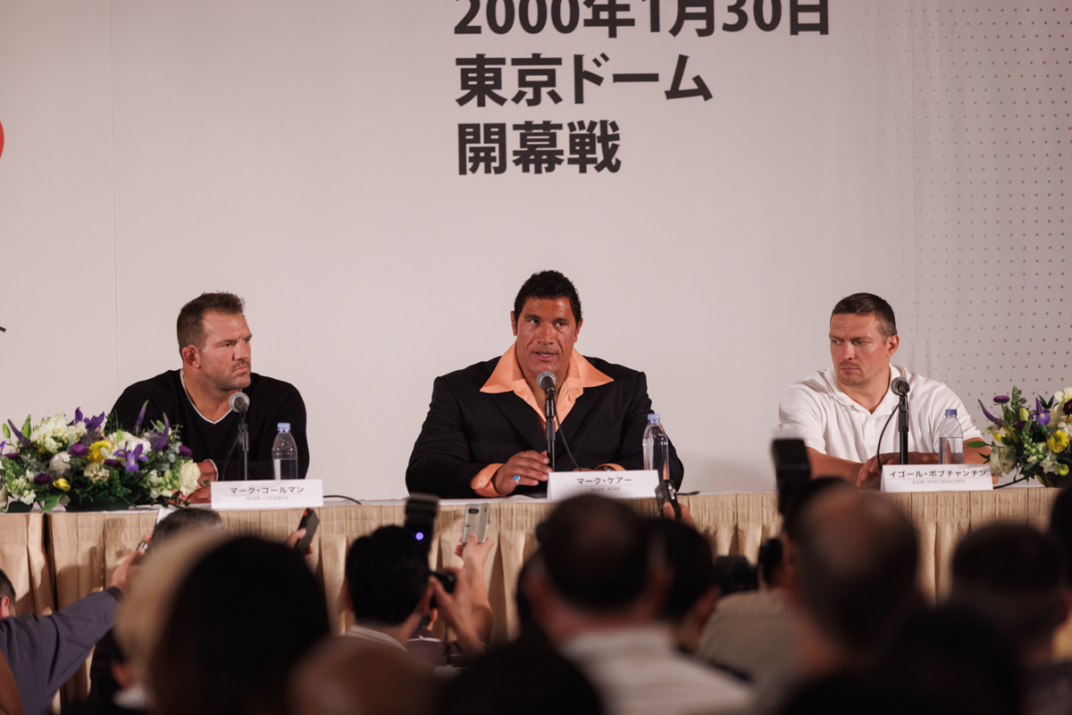 Ryan Bader as Mark Coleman, Dwayne Johnson as Mark Kerr, and Oleksandr Usyk as Igor Vovchanchyn in The Smashing Machine. Courtesy A24. Photo: Eric Zachanowich.