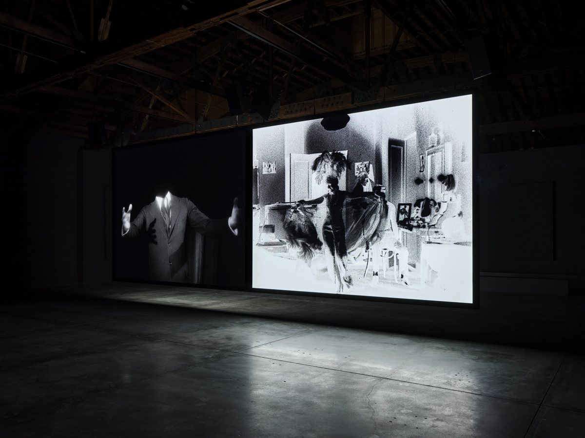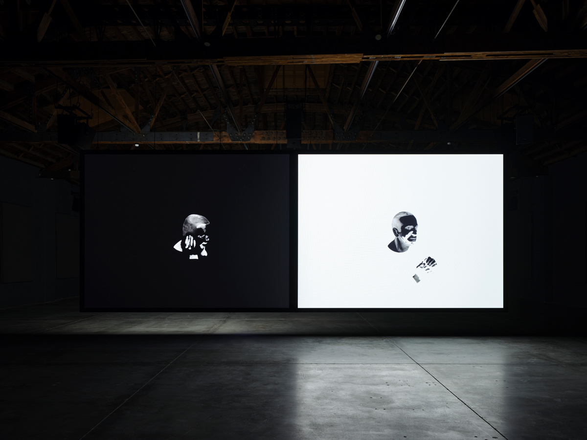 Blackface, perhaps by virtue of its publicness, has been over-indexed, like colored water fountains, becoming a stock emblem of a murderously racist regime. McQueen’s doubling and distortion of a canonical instance bends the problem posed by the performer away from simple humiliation and back toward violence. It is not only domination or extermination the colonizer wants, but possession. They want to walk like you, talk like you, but then the gunshots ring out. Although elsewhere it is a different game, here, they play at blackness, sometimes drawing as near as the skin. We, or our fathers or mothers or theirs, hear the padded paws, the barks and howls. Even now, there, at the border, in Ohio, in the White House, you can hear it—the dogs straining to be loosed.