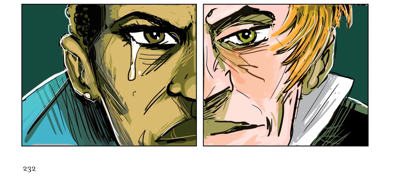 In Kindred, Butler recenters the time-travel narrative, historically by and about white men, around black female experience; and introduces an explicitly contemporary, reflexive frame to the neo-slave narrative. It’s an ingenius project, and Butler is a remarkably complex storyteller. Yet her style can sometimes feel a bit wooden, favoring extended dialogue sequences and utilitarian prose. In Duffy and Jennings’s adaptation, the story is streamlined and newly invigorated. Some secondary characters have been collapsed, and many of Butler’s long sequences of dialogue have been trimmed down and presented inventively, for example, with hydra-headed speech balloons. Meanwhile, Jennings’s depictions are emotive and kinetic. His frenetic, at times furious lines skillfully illustrate characters’ shifting moods—we see Dana’s anger flatten to resignation, Rufus’s affection sour to hateful petulance. Jennings’s dynamic style also contributes movement to sequences where there is little action.