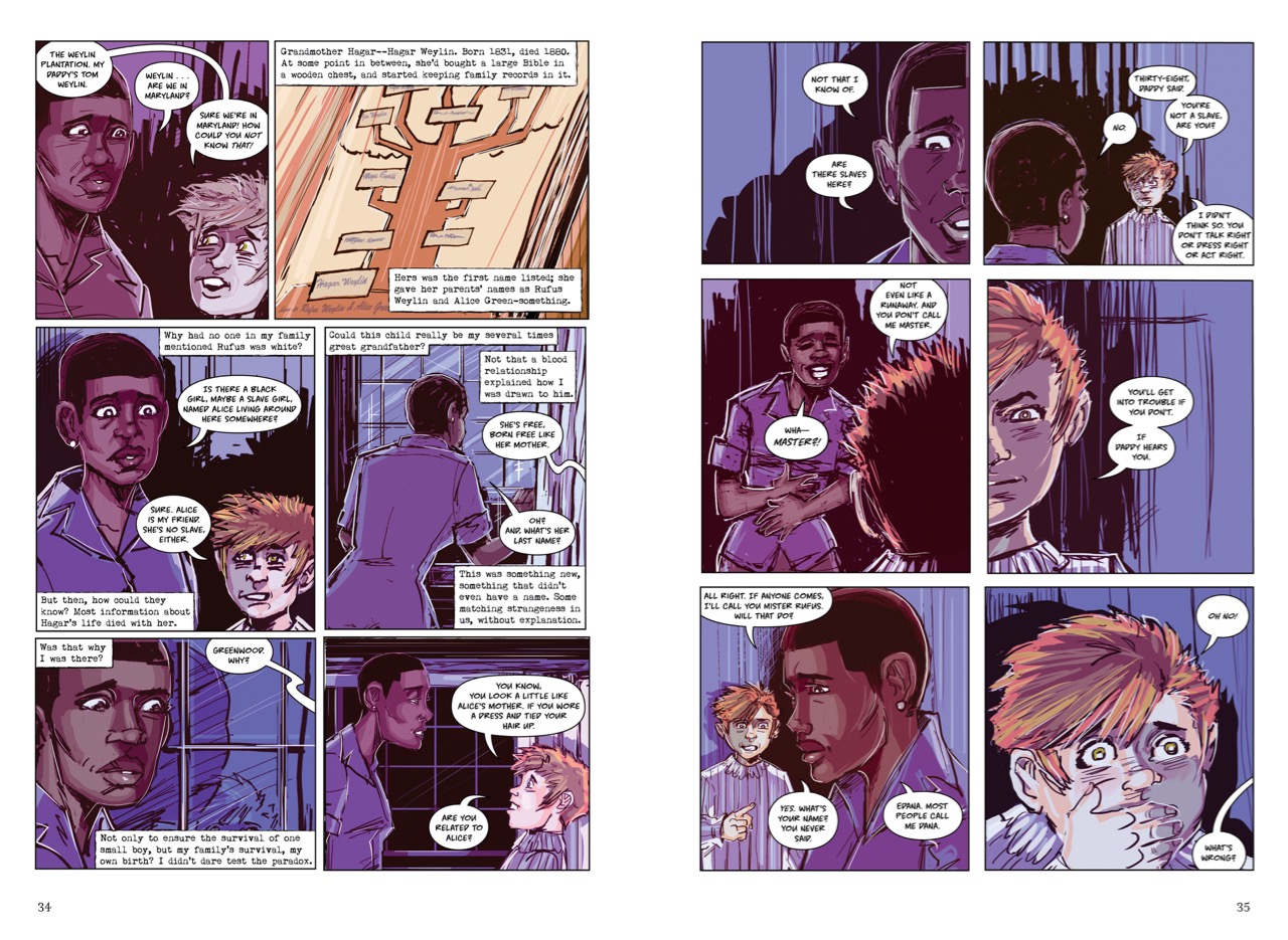 “History is another planet,” Butler often noted in talks. When Dana first finds herself transplanted to antebellum Maryland, her alienation is profound. But it quickly dissipates as she assimilates into this new world, and she even begins thinking of the Weylin house, not without horror, as “home.” Jennings and Duffy highlight this new normal by presenting the nineteenth century in full color. Interior scenes, for example, are often warmly alluring with the bold yellows and oranges of the strong candlelight of pre-electric living. In contrast, Jennings colors the 1976 scenes with muted sienna tones that have a worn-out look. If the historical past is insistently alive, Dana’s present is exhausted from it.