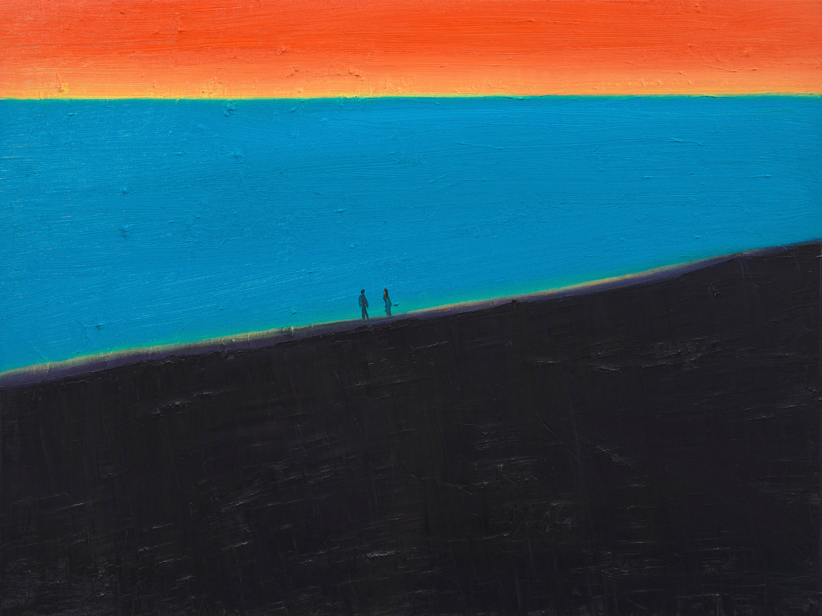While in some later landscapes the surfaces are flatter, and the lines demarcating geographic features clearer, the atmosphere of solitary brooding remains. Three smooth bands of unvariegated color portray earth, ocean, and sky in A Walk by the Sea (2019), an image that might signal an association with Rothko if not for the exceedingly tiny figures at the water’s edge. This exact point of view is replicated in a different painting with the same title, although the striations of color are more mixed, the people slightly larger. Wong’s repeated inclusion of such figures—anonymous and typically alone—in domains abundantly populated by sun, sky, trees, and stars can certainly be understood as reflecting a psychological state. But his pictorial world is also one dominated by paths that press through forests and across fields toward uncertain regions. Human presence is obliquely alluded to rather than articulated with directness and detail. We are more palpably evident, Wong may be suggesting, in our journeys forward, in our ongoingness.