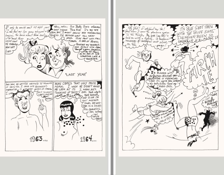 At play is a sensibility—antic, disruptive—sounding notes both juvenile and erudite. In another panel, the breast of a standard-issue Veronica is marked with a polka dot–like nipple as other dots float off her dress to hover in the air. In the preceding panel, Archie strikes a Whitmanesque tone, declaring, “I chug into Veronica’s harmonica. O naked girls of Amer. I love your tender sighs, your one taut nipple.” Archie is then depicted in Superman garb, and in the final panel (jammed with more off-kilter ruminations), the Man of Steel’s cape, boots, pants, and underwear fly skyward, sans Archie.