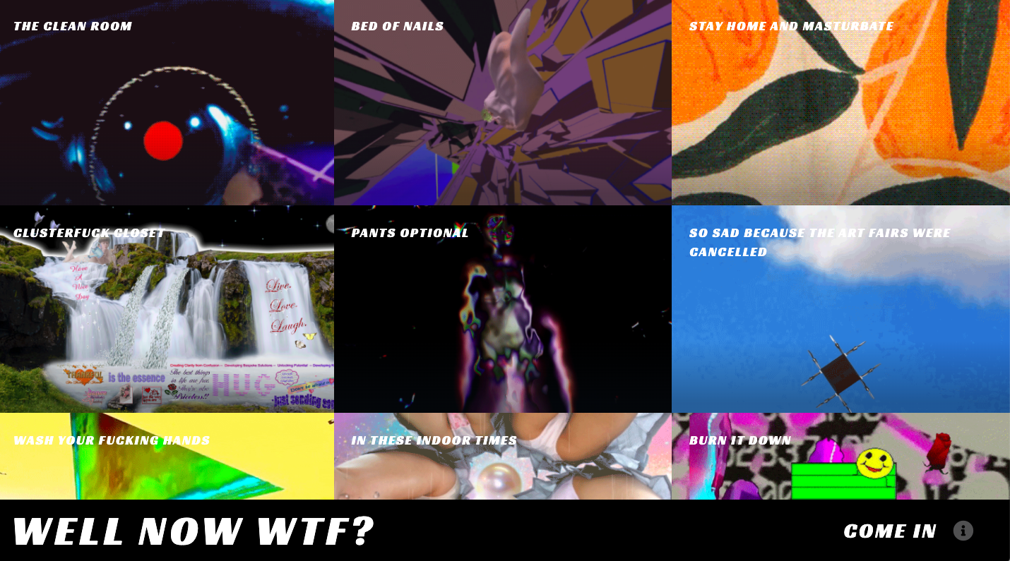 Curated by Wade Wallerstein, Faith Holland, and Lorna Mills, and designed by Kelani Nichole, the virtual exhibition Well Now WTF? focuses on the GIF—the simple moving-image format that has been a part of the visual language of the internet since 1987. Over 120 works were assembled in a matter of weeks after major US cities began their lockdowns, and the effect is dizzying. Slick computer-animated renderings of impossible geometries vibrate next to Boschian hellscapes of writhing naked bodies and malformed chimeras. Contemporary art stars like Ryan Trecartin share space with net art pioneers like Jan Robert Leegte, along with art-school students such as Sydney Shavers. The sick and the sickly sweet rub up against each other in a cacophony that, to me, feels a truer representation of the mediated age of COVID-19 than the daily ritual of Instagramming sourdough starter. Our mantra may be one of isolation, but online—where most of the action takes place these days—information and pixels mingle freely.