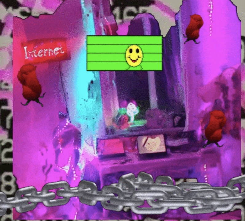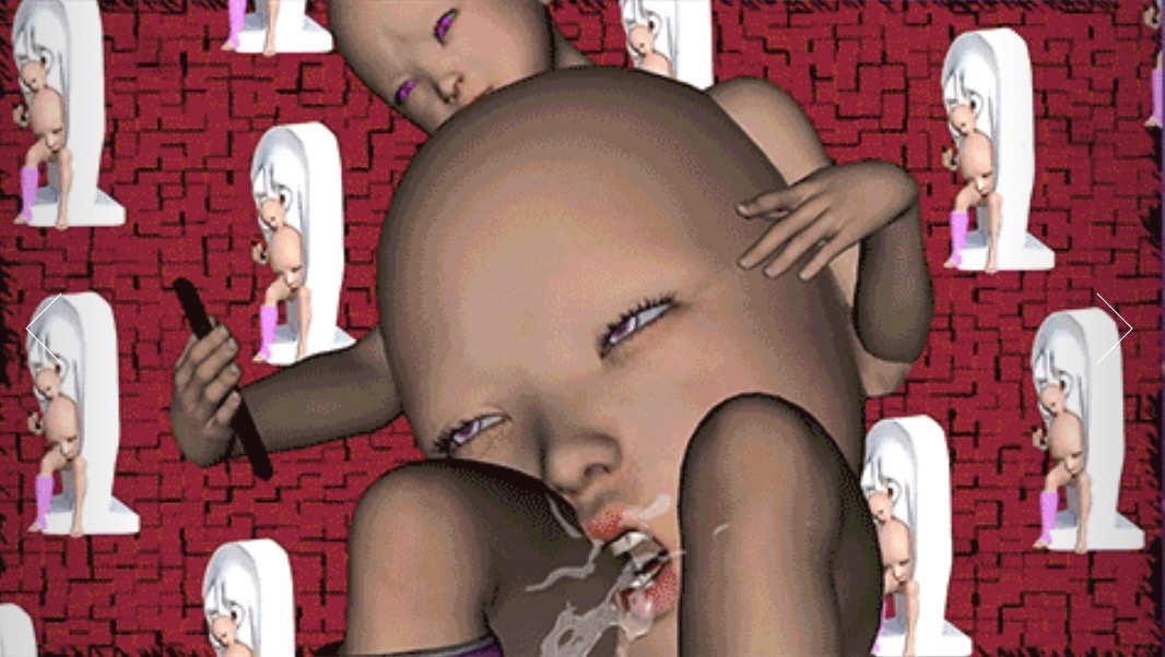 Visitors enter the show through a home screen, which opens onto a thumbnail gallery of “rooms” populated with around a dozen moving images each. Click through to see everything in the room or jump around using the top menu. A prevailing language of the grotesque, absurd, and abject connects much of the art on view. Wednesday Kim’s 3D animation is particularly unnerving, a grid of dolls whose stomachs consist of even larger dolls’ heads that puke on repeat. Other contributions, like Petra Cortright’s, take a more stripped-down approach: her piece consists solely of black-and-white text arranged into a haunting image of an altar and cross. Some works were made for the show, while others had been created before COVID and were solicited by the curators. The most successful GIFs understand the conventions of the format—the frenetic pace, the flat perspective—and explode them. In this vein, Hannah Neckel’s 666 is a bubblegum landscape layered with twisting chains, flashing numbers, a warped 3D interior, and a flat, web-1.0 smiley face hopping down a set of stairs and then flipping over to reveal a crudely drawn backside.