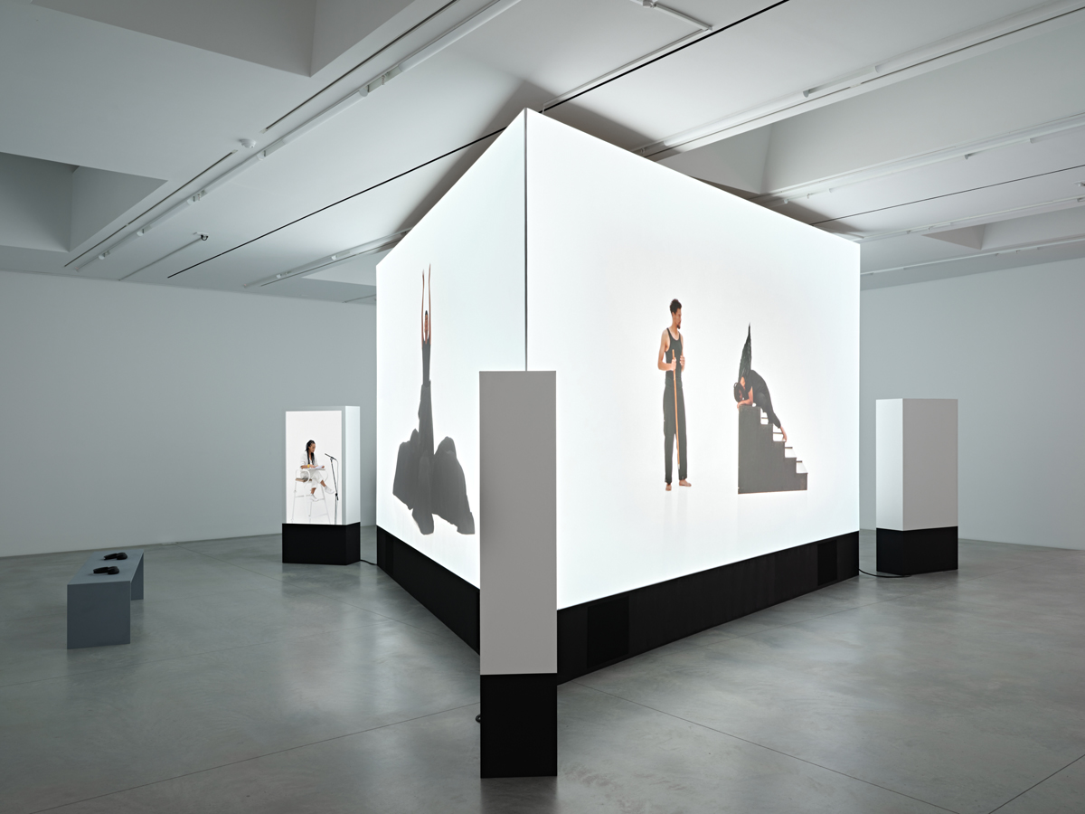 This kind of visual fragmentation, elaborate obstruction, or psychic interruption—which makes the viewer unable to take everything in—is a hallmark of the exhibition. In the second building, A World of Illusions (2017–19) is composed of screens sculpturally staged in a triangle in the center of the room. This film installation consists of three volumes—Narcissus and Echo (2017), Oedipus (2018), and Antigone (2019)—that adapt Greek mythology, cumulatively intervening in its cultural hegemony. Each volume comprises two channels, one large horizontal screen and one smaller vertical screen to its left (different sound emanates from speakers and headphones). An ensemble of Black actors performs, mimes, dances, and gestures on the larger screens. As if to marginalize the storyteller and the writer, each diminutive screen shows Kilomba reading, alternating between looking down at the script that radically reimagines truth and power and looking devotedly at the players on the larger screen next to her.