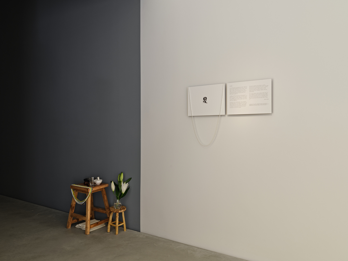 The image that still haunts me and who I really am is not Kilomba’s own, but one that she, as part of The Desire Project installation, appropriates and places in the middle of a white canvas. It’s an archival drawing of the African woman Escrava Anastácia, a venerated folk-saint figure in Brazil, where she was enslaved. Anastácia’s face, with her piercing eyes, is tiny, floating in the middle of a white expanse—though it’s not her face necessarily that I remember, but the way it is sealed shut, robbing her of speech. “THE MASK,” which appears on a second identical white canvas directly to the right, is an understated word to describe the brutal iron torture device that—by way of a bit clamped between jaw and tongue—fastens her mouth and spiders over her face. Hung around and over the canvas with Anastácia’s face is a long thin necklace with delicate white beads. The work operates like a shrine: to the left are more beaded necklaces—white, light blue, yellow, multicolored—white candles, a glass of water, a bowl of coffee, a pipe, and white lilies on two wooden stools. In the same room is an arresting installation, Table of Goods (2017), which is a sizable pyramidical burial pile of soil patterned with little circles of colonial commodities—chocolate, cocoa, sugar, coffee. Around the perimeter are unlit white candles, further suggesting mourning and grief.