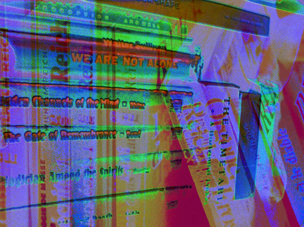 Preiss and McElheny have acknowledged the influence of Jorge Luis Borges’s short story “The Library of Babel” (1941), which offers a brilliant, brain-scratching disquisition on bibliotecas as conduits both of infinity and meaninglessness. I also found myself thinking of Arthur Fournier, in D. W. Young’s documentary The Booksellers (2019), who spoke of “the psychic dreaming that paper allows.” Like Pleasanton, like Ghadiali, the filmmakers focus on color and light, shooting individual book covers so that they recall a Fillmore East poster or Kenneth Anger’s Invocation of My Demon Brother. Old formats—VHS video, 35mm slides—are resurrected and then refilmed on a 16mm handheld Bolex camera to produce a temporal fugue. Burgin’s books are no longer physical objects; they’re on their way to becoming spirit dancers.