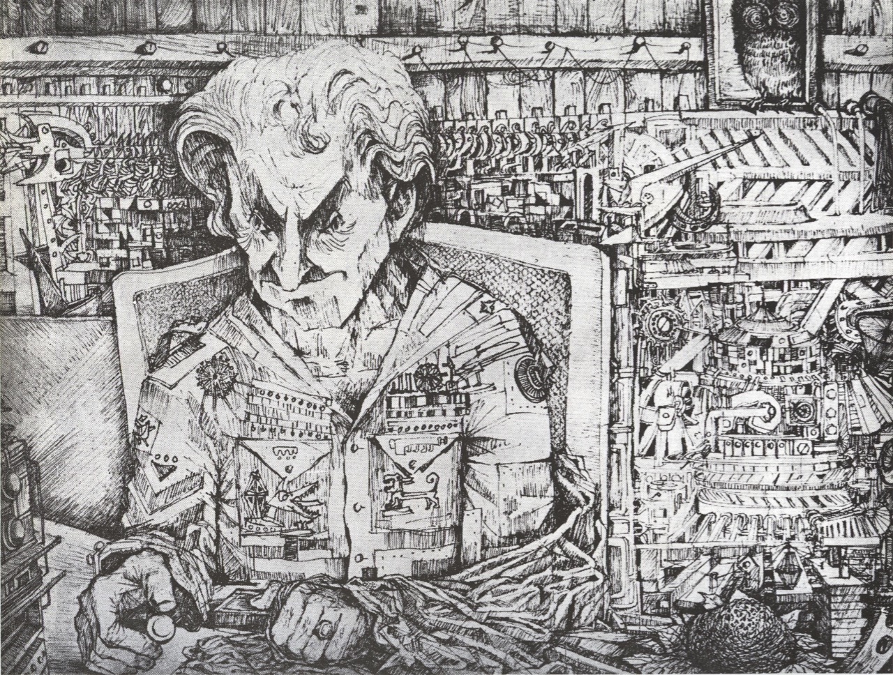 Abdel Hadi al-Gazzar, From the Cosmos or Man and Mechanics, 1964. Ink on paper, 6 × 4.3 inches. Image courtesy Christies.