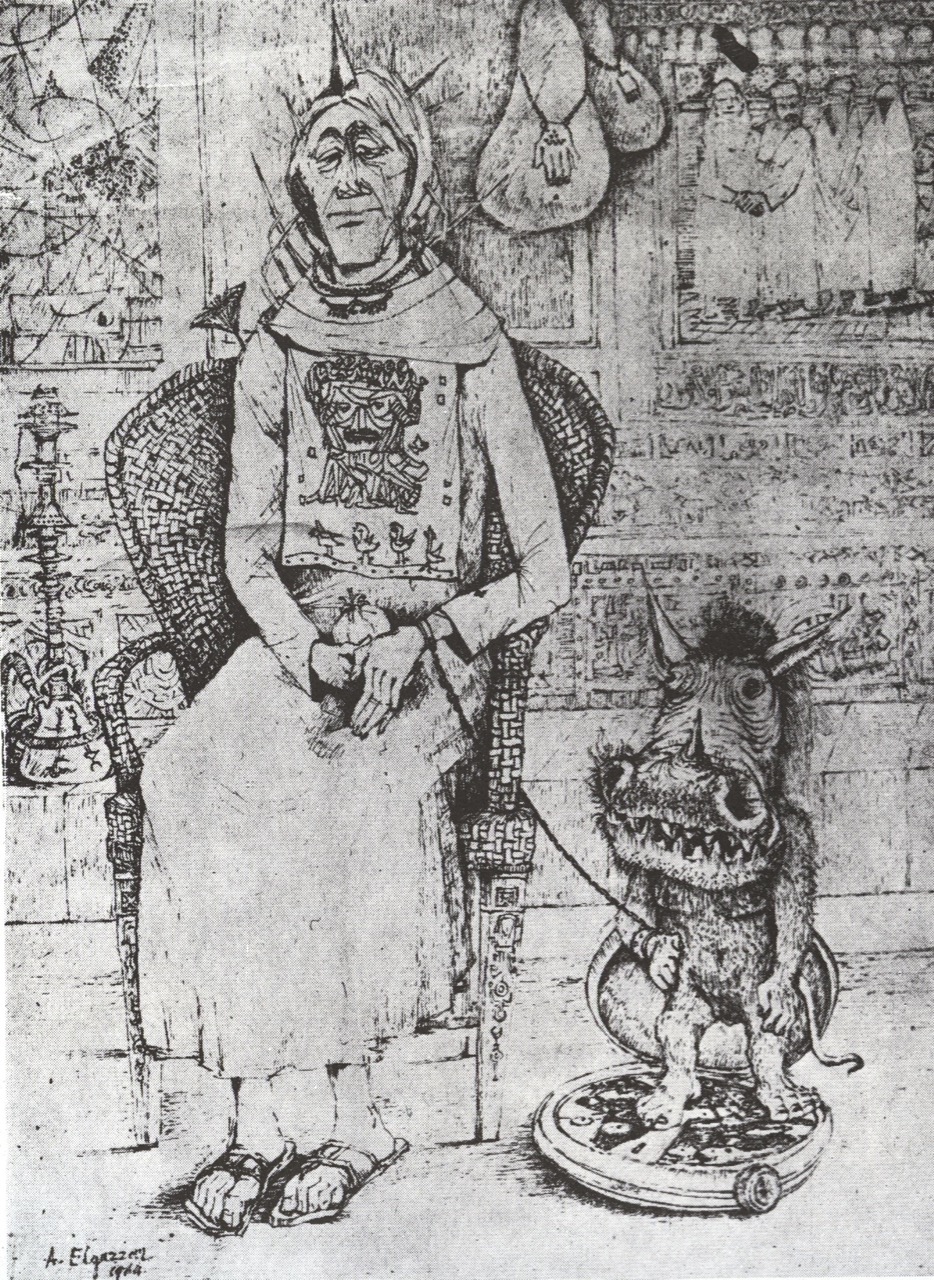 Abdel Hadi al-Gazzar, Chain and Time or Waiting for the End, 1964. India ink on paper, 11 × 14.5 inches. Image reproduced from Sobhi al-Shorouny, Abdel Hadi al-Gazzar, 2007.