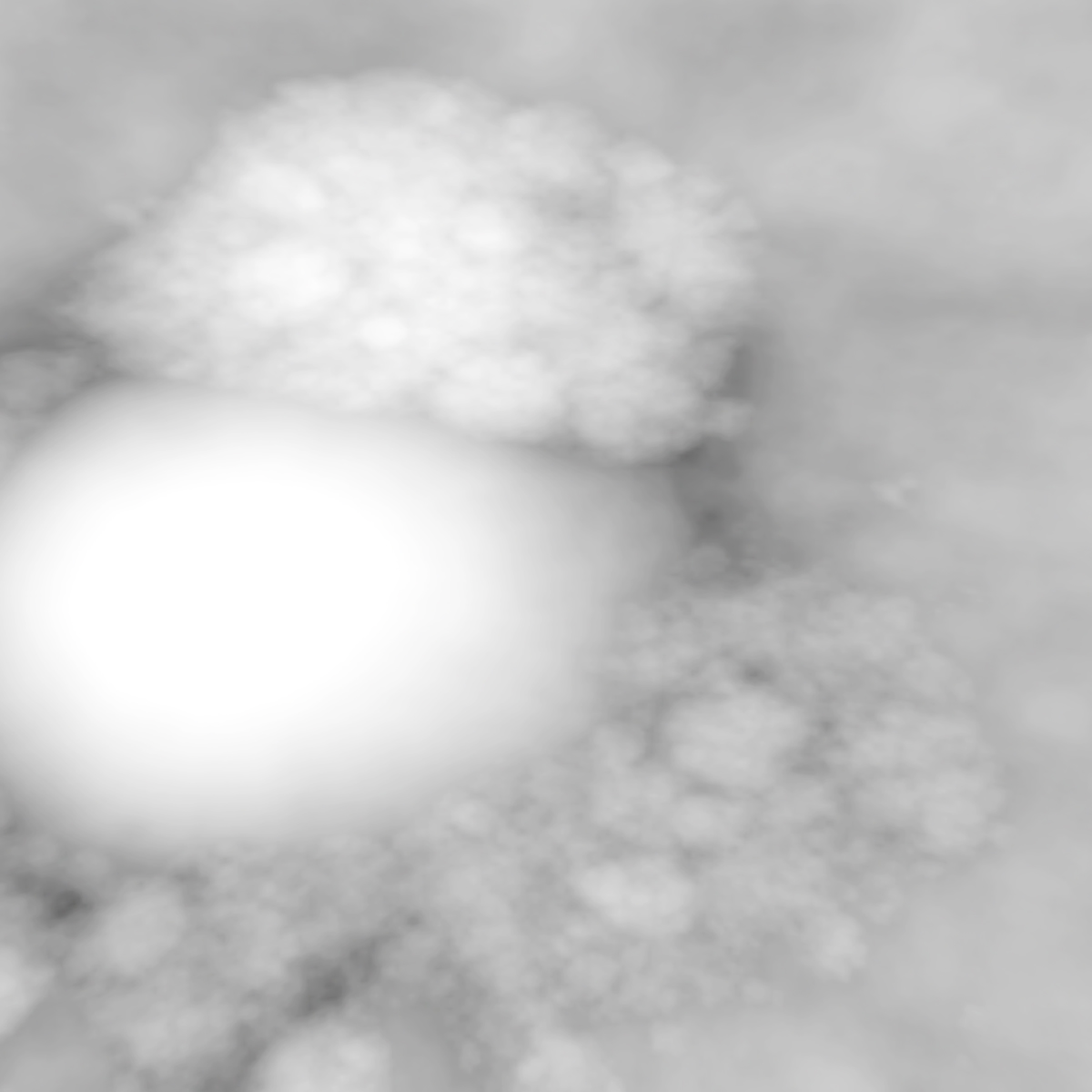 The split-level gallery is loosely divided into four zones, with the lower level chiefly occupied by two series of photograph-like black-and-white inkjet prints generated by a Cinema 4D computer program. The six chiaroscuro examples from SRF (2020–22) conjure associations of light playing on a swampy surface, or maybe, on a more macro scale, of the Earth seen from an interplanetary distance; the five grisaille prints from NBF (2023–24) numinously evoke cloudlike amoebas or irregular bubbles of bacteria. These ambiguous, more cerebral evocations of the natural world demurely set the conceptual stage for the vibrant heart of the exhibit, a few steps up on the gallery’s second tier: a choreography of glowing screens and living furniture-sculptures illuminated by grow lamps.