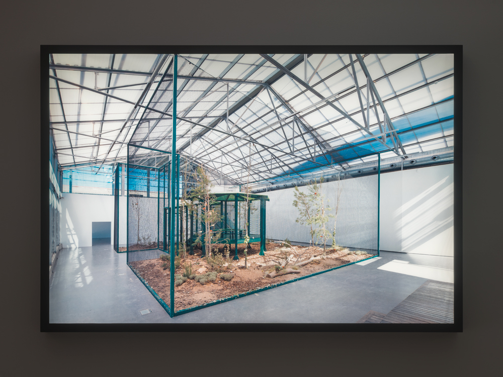 First, the lightbox Birdhouse III (2024) presents a lustrous image of Blum’s 2013 installation at La Conserva Centro De Arte Contemporáneo in Murcia, Spain: a spacious, screened-in enclosure, like a terrarium at architectural scale, complete with soil, rocks, and trees, on whose branches are perched round reddish beings. A forest-green pagoda sits behind them—audiences were invited to enter this nesting-doll metal structure to view the parrots up close, both human and bird held captive within the artwork (though the humans were the only ones with the choice to leave).