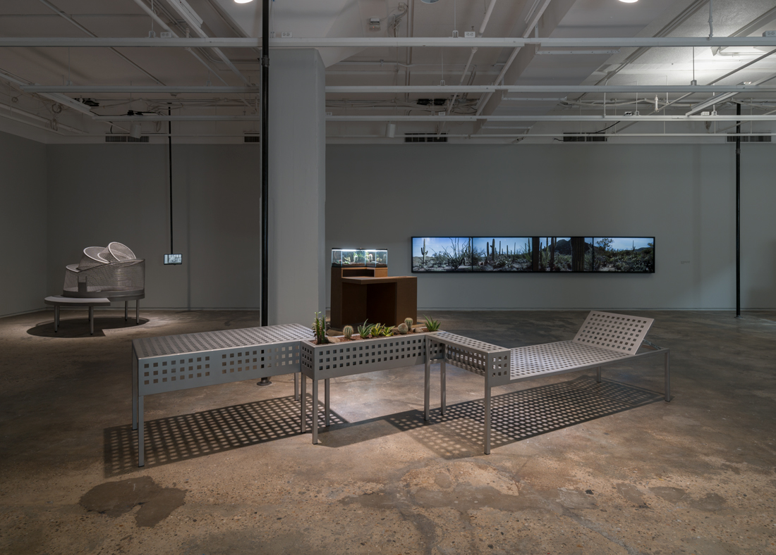 Andrea Blum: BIOTA, installation view. Courtesy Hunter College Art Galleries. Pictured, foreground: Lizard, 2008. Background, left to right: Babel, 2008; Canary, 2021/24; Cactus I, 2009; Desert Panorama, 2019/21.