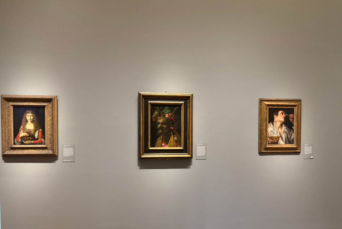 Caravaggio’s Boy with a Basket of Fruit in Focus, installation view. Photo: Ania Szremski. Pictured, center: Giuseppe Arcimboldo, Four Seasons in One Head, ca. 1590. Right: Annibale Carracci, A Boy Drinking, ca. 1583.