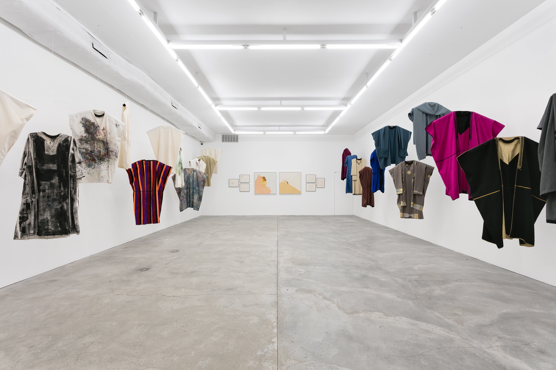 Some of those mischievous lines make their way onto the fabric smocks hung from the ceiling along the adjacent wall (most dating 1980/2013), revealing how closely related these two practices were for the artist. The large, boxy smocks are sometimes smeared with thick smudges of paint, or covered with scrubby fields of black, with doodle-like drawings hiding here or there. Across the gallery, a second series of more unassuming, mostly monochromatic kaftans (1970s–90s) feature striking piping in contrasting colors. All of these dresses are beautiful, but none of them in the way we might typically think of flattering clothes that would define a woman’s form. Throughout her practice, Caland certainly trafficked in bodies and beauty, but never in obvious ways (and that extended to her own body—she once decided to gain weight just to see what it would feel like, and didn’t stop until she was over two hundred pounds).