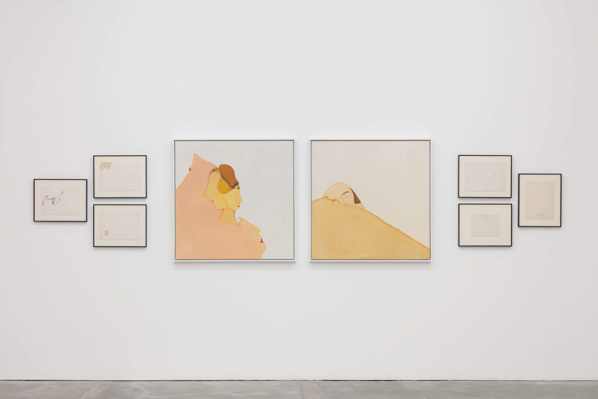 The show includes a succinctly edited suite of line drawings, oil paintings, and garments, all dating from 1964 to 2013. The two medium-sized paintings centered on the gallery’s far wall are paradigmatic of Caland’s earlier work from the 1960s and 1970s: sinuous lines give shape to drifts of pale, sherbet colors (here, peaches and creams); faces bubble out of amorphous forms that might suggest more intimate body parts. In Sunrise (1973), a quarter of a face peeks up behind a breast-like mound crested with the most briefly delineated suggestion of nose and lips. In Eux (c. 1975), a whipped mass of flesh-like pink ripples into surreal suggestions of mouths, eyes, and chins. Accompanying ink drawings from 1972 (all untitled) share that same lithe, economical, sometimes trembling line, which either wavers all the way across the page or wanders around in a single corner to create strange, whimsical visages.
