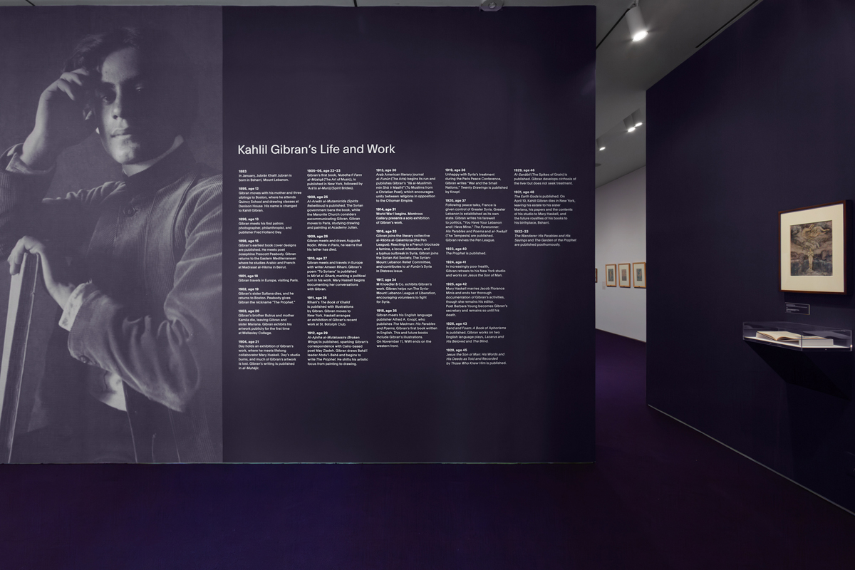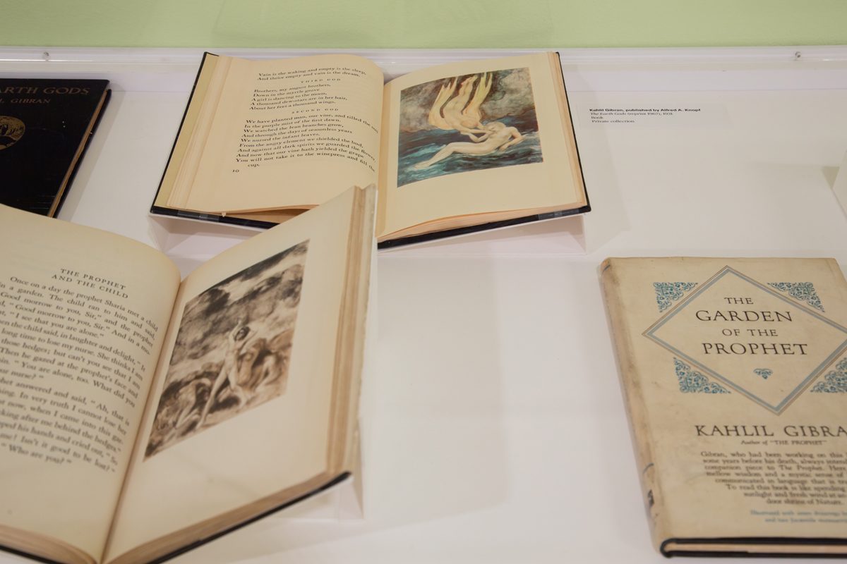 He was born in 1883 as Jubrān Khalīl Jubrān in a Mount Lebanon village in Ottoman Syria. When he was twelve, his mother packed him and his siblings up and headed for Boston to escape his deadbeat dad. Like so many others, he got a new name, the one we know him by now, when he arrived in America, thanks to a clerical misinterpretation at immigration. Gibran loved to paint and draw and eventually caught the eye of photographer and publisher Fred Holland Day, who enjoyed inviting “ethnic” children into his studio, dressing them up in fantasies of Orientalist garb, and taking their portraits (one of Gibran is reproduced on the title wall). The teen started designing book covers for him, some of which are on view in a vitrine at the exhibition’s start, along with his adolescent landscape paintings. Gibran’s mother worried about the nature of her son’s increasingly close relationship with Day, and, in 1898, sent the fifteen-year-old back to the Levant to study at a Maronite Christian school, where he learned how to write in Arabic—the language of his first books.