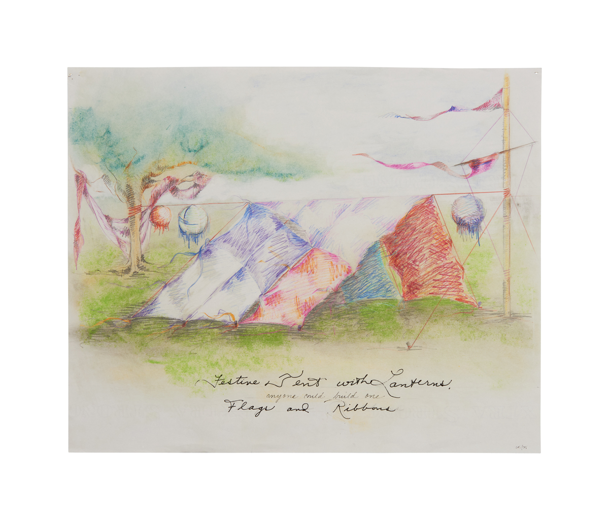 Rosemary Mayer, Festive Tent with Lanterns, 1975. Colored pencil and pastel on paper, 14 1/2 × 17 3/4 inches. Courtesy the artist and Amant.