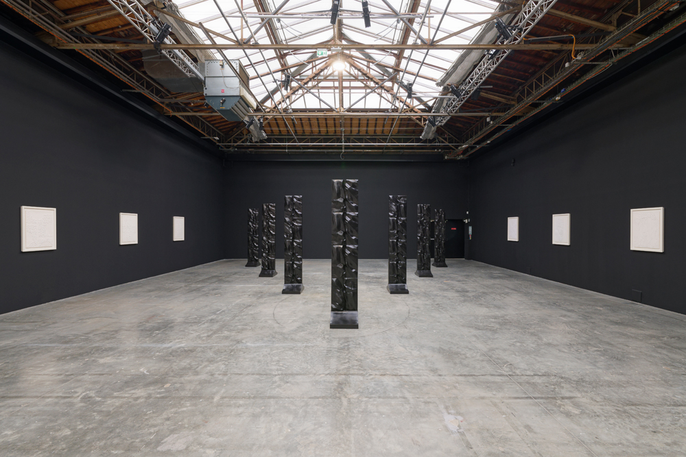 The White Drawings (which span up to 2023) are placed on black-painted walls surrounding seven of Chase-Riboud’s Black Standing Women of Venice (1969–2020), a series of regal bronze sculptures arranged on the floor in a pyramidal formation. Each is tall and rippled, with four rectangular slabs stacked in a vertical column and variations on a central crevice running through them from top to bottom. All are dedicated to female poets, from ancient to medieval times, most of them forgotten. Taken together, the forms nod to Egyptian obelisks, Chinese funerary steles, Alberto Giacometti, and Constantin Brâncuși. In conversation with the drawings, they might lead you to think about materials, abstraction, the politics of memorialization, or the balance struck by a visual artist who is also an accomplished novelist and poet. The strength of this particular pairing raises inevitable questions about the exhibition overall. Is this the show Chase-Riboud deserves? Or do so many locations spread her work too thin, diminishing its power by severing the connections among pieces?