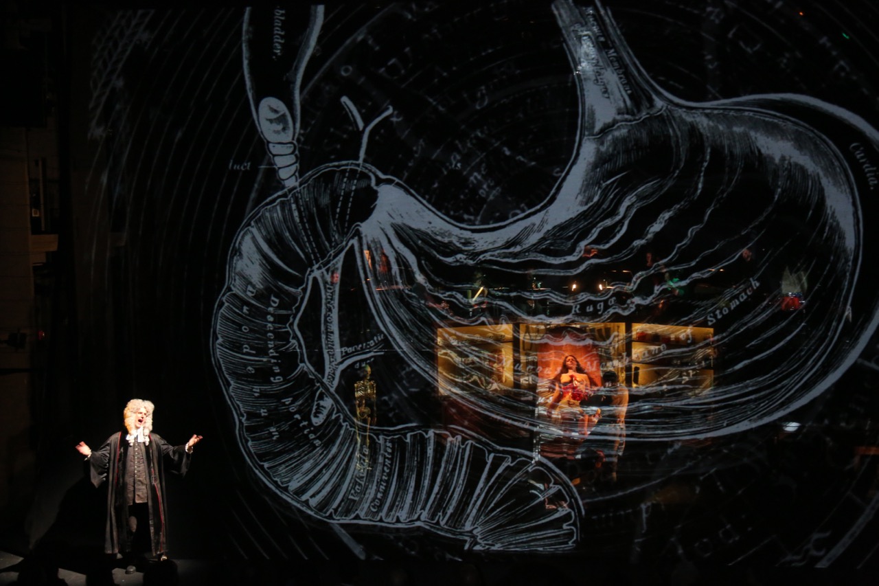 As the cutting commenced, out popped the organs, each inspected for moral abnormalities by a dutiful yet skeptical assistant, played by the sensitive tenor Timur. Baritone Robert Osborne was serviceable if a bit stiff as the assistant’s expert anatomist-boss, bent on finding the evil in the fallen Eve. Co-creator and co-librettist Mark Dion, known for his critiques of historical science but here in more of a Disney mode, contributed the cabinet-of-curiosities set design, complete with the requisite skulls on shelves and organs in jars. And the Ridge Theater team worked its reliable magic: projections of historical woodcuts and drawings from Laurie Olinder, subjected to expressionist decay by the filmmaker Bill Morrison; competent direction by Bob McGrath.