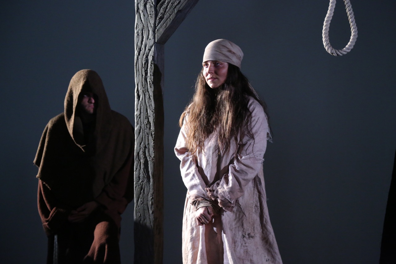 In the theater, where the noose was readied, the condemned (mezzo soprano Peabody Southwell) stood shackled and quivering. Her subsequent confession of murder—a paroxysm of vitriol, regret, and fear—would prove to be the musical highlight of the evening. Southwell’s range is almost unsettlingly huge, a Bruegelesque continuum of forsaken and redeemed realms. Gravelly lows conveyed bitterness as a victim of rape and physical abuse, while rich, round operatic highs suggested remorse at smothering her children. Angel and devil each had their timbre. Like her life, her confession was over too soon.