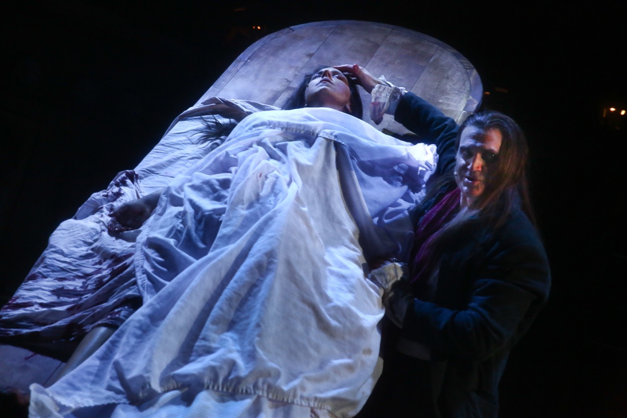 But there was still that spleen to get to. The master of ceremonies for the evening would be the broad-chested Joshua Crouch (the resonantly voiced baritone Marc Kudisch), a cartoonish carnival-barker type whose job was to set the stage for the proceedings to come, addressing BRIC’s audience as if they were that old-time rabble. If he was something of a musical-theater caricature, he also represented the show’s darkest truths. In one of the more memorable sequences, a physician and his assistant enumerated the fifteen instruments that would be used during the proceedings. As they sang of “penetrating the flesh,” Crouch simulated masturbation while leering at the bare-breasted corpse. It was garish, and yet it revealed what had until then only been a subtext: the proximity of female public dissection to sexual violence itself, with no sharper instrument than the audience’s gaze. But more on that below.